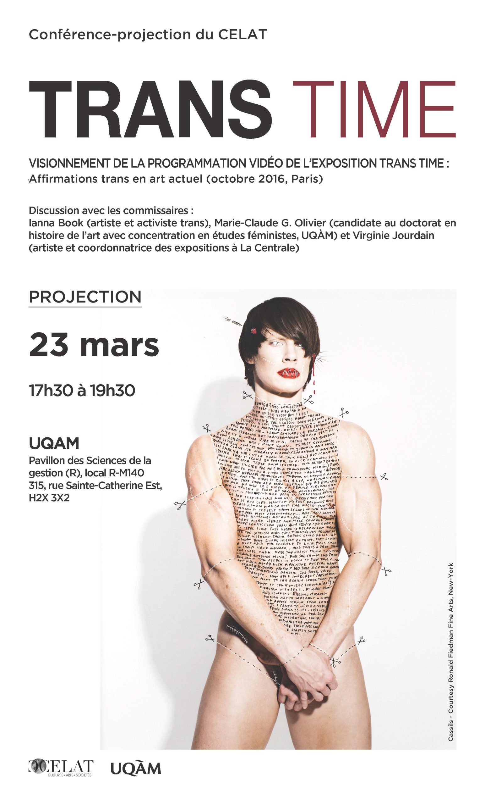Le 23 mars prochain, Marie-Claude G. Olivier, doctorante au CELAT, présentera un documentaire sur l’exposition « TRANSTIME. Affirmations trans en arts actuels ». La projection se fera en présence des commissaires de l’exposition – Ianna Book, Marie-Claude G. Olivier et Virginie Jourdain.