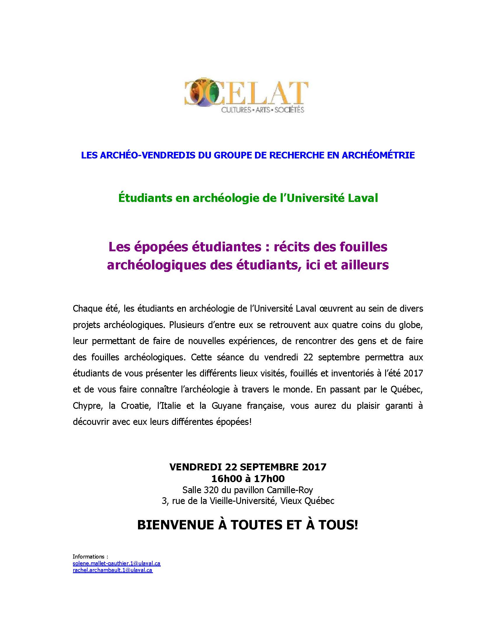 Vendredi 22 septembre 2017, le groupe de recherche en archéométrie, accueillera son premier archéo-vendredi de la session. Cette première séance, intitulée Les épopées étudiantes : récits des fouilles archéologiques des étudiants, ici et ailleurs, donnera la parole à plusieurs étudiants qui présenteront les fouilles archéologiques qu’ils ont menées cet été aux quatre coins du globe.