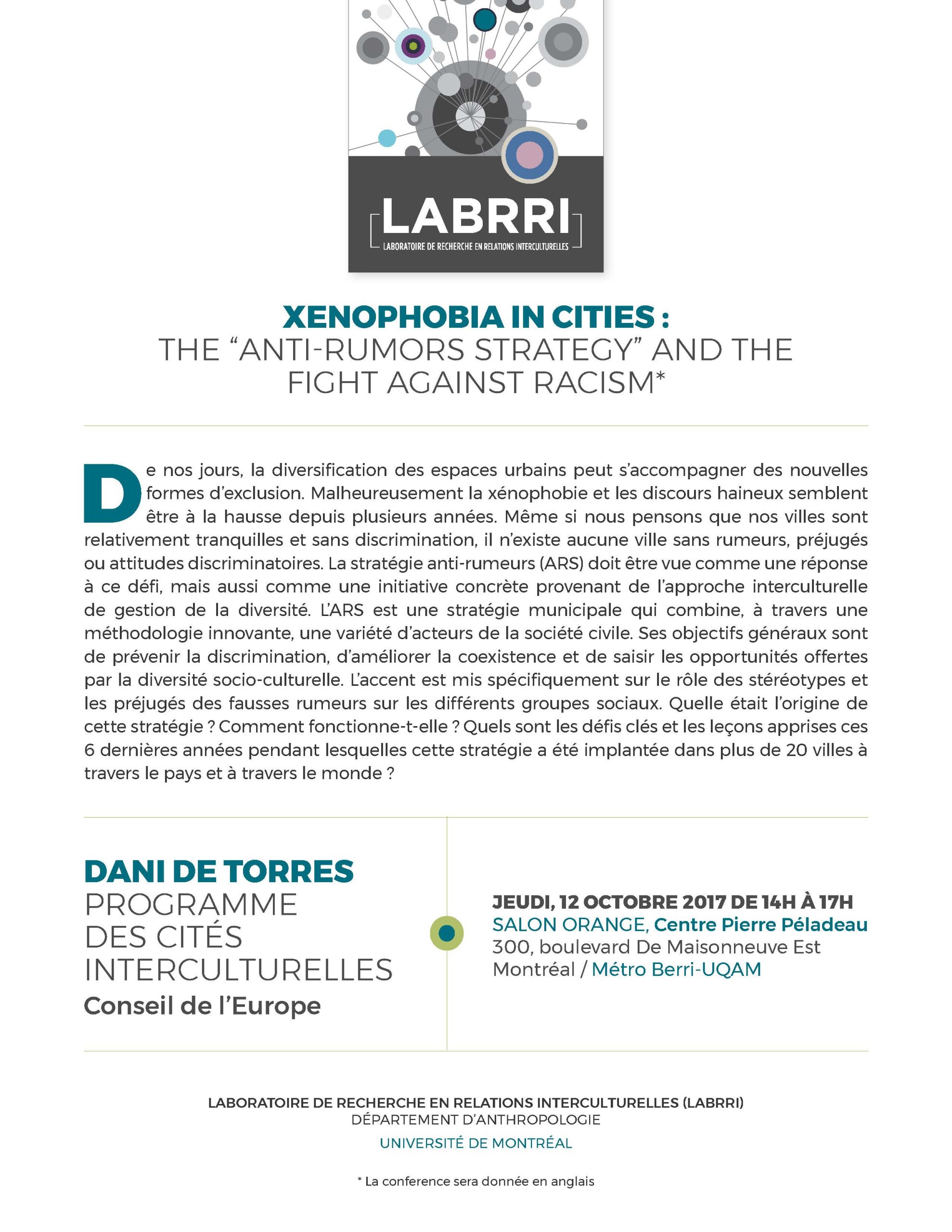 Jeudi 12 octobre 2017, le Laboratoire de Recherche en Relations Interculturelles (LABRRI) dirigé par Bob White, accueille pour une conférence Dani De Torres expert au Conseil de l’Europe. La communication intitulée « Xenophonia in Cities : The « Anti-Rumors Strategy » and The Fight Against Racism » aura lieu de 14h à 17h, au Salon Orange du Centre Pierre Péladeau au 300 Boulevard De Maisonneuve Est à Montréal.
