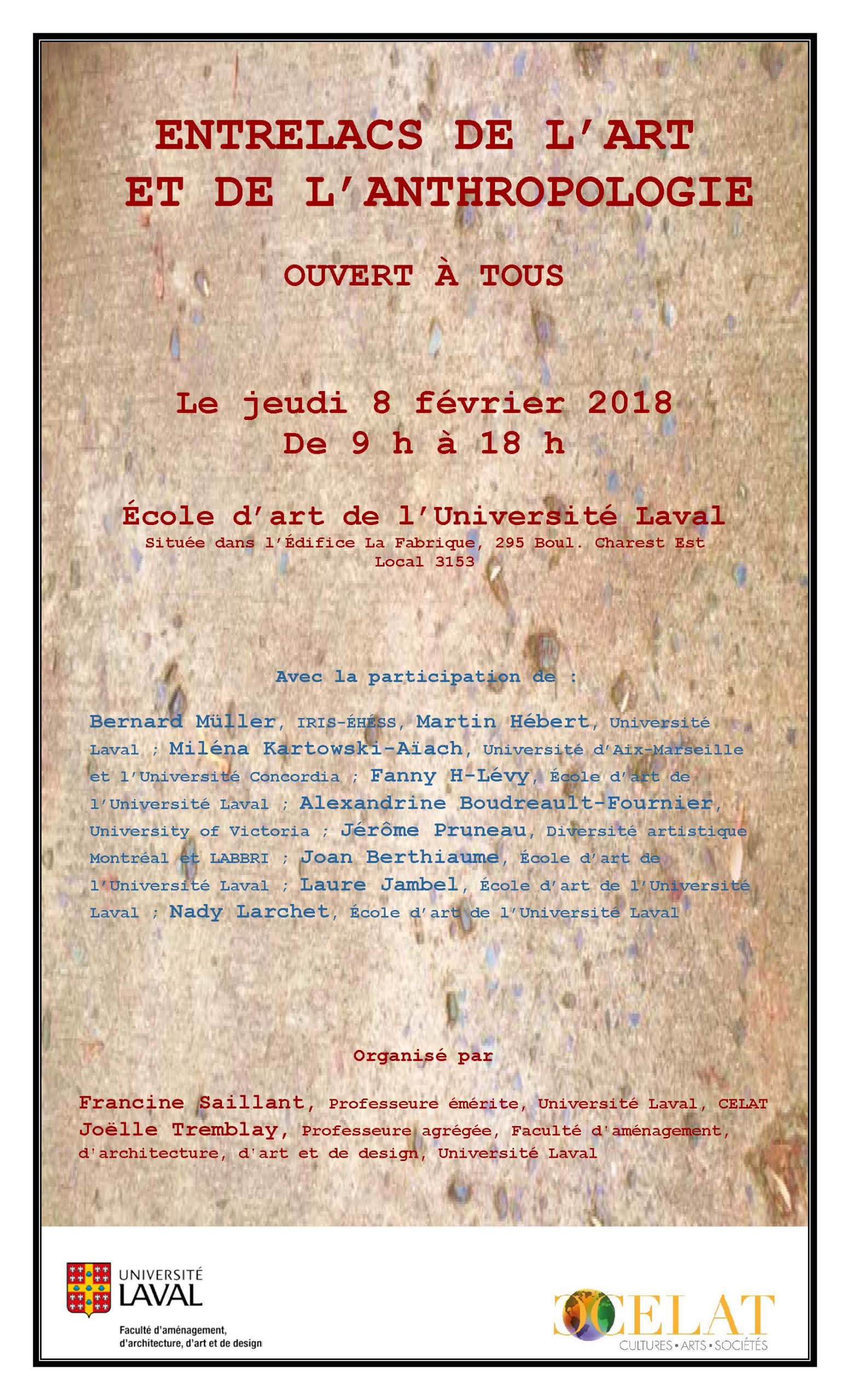 Jeudi 8 février 2018 de 9h à 18h, Francine Saillant (CELAT) et Joëlle Tremblay organisent un séminaire ouvert à tous « Entrelacs de l’art et de l’anthropologie« . Ce séminaire, subventionné par le comité des activités scientifique du CELAT, se veut une rencontre entre anthropologues et artistes où chacun parlera de son approche artistique ancrée dans le social cela en écho avec une discipline qui de plus en plus intègre la démarche artistique dans ses méthodes, soit l’anthropologie.