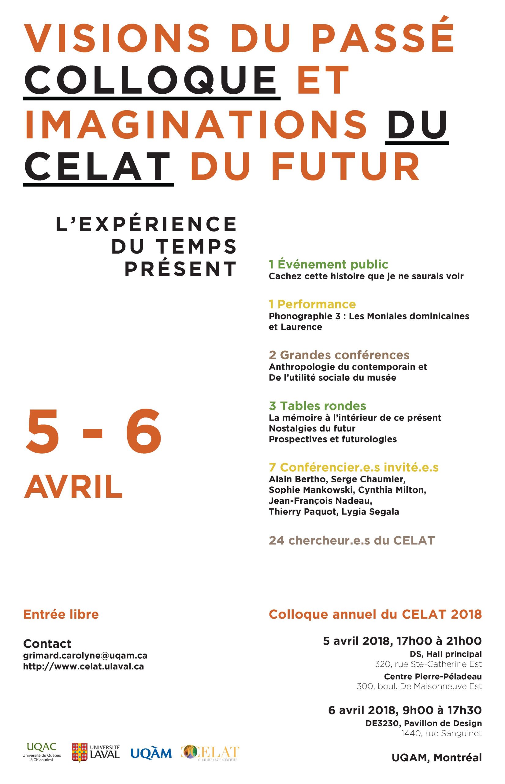 Le colloque annuel du CELAT réunira chercheurs et créateurs en les amenant à documenter et à exposer des cas d’étude, des pensées, des concepts, des pratiques où le passé comme le futur sont investis autrement, par des voix oubliées ou nouvelles, occultées ou surgissantes, par les chemins de la fiction devenant méthode d’investigation, par des mises en abyme ou par tout autre procédé narratif, discursif, expérientiel ou créatif