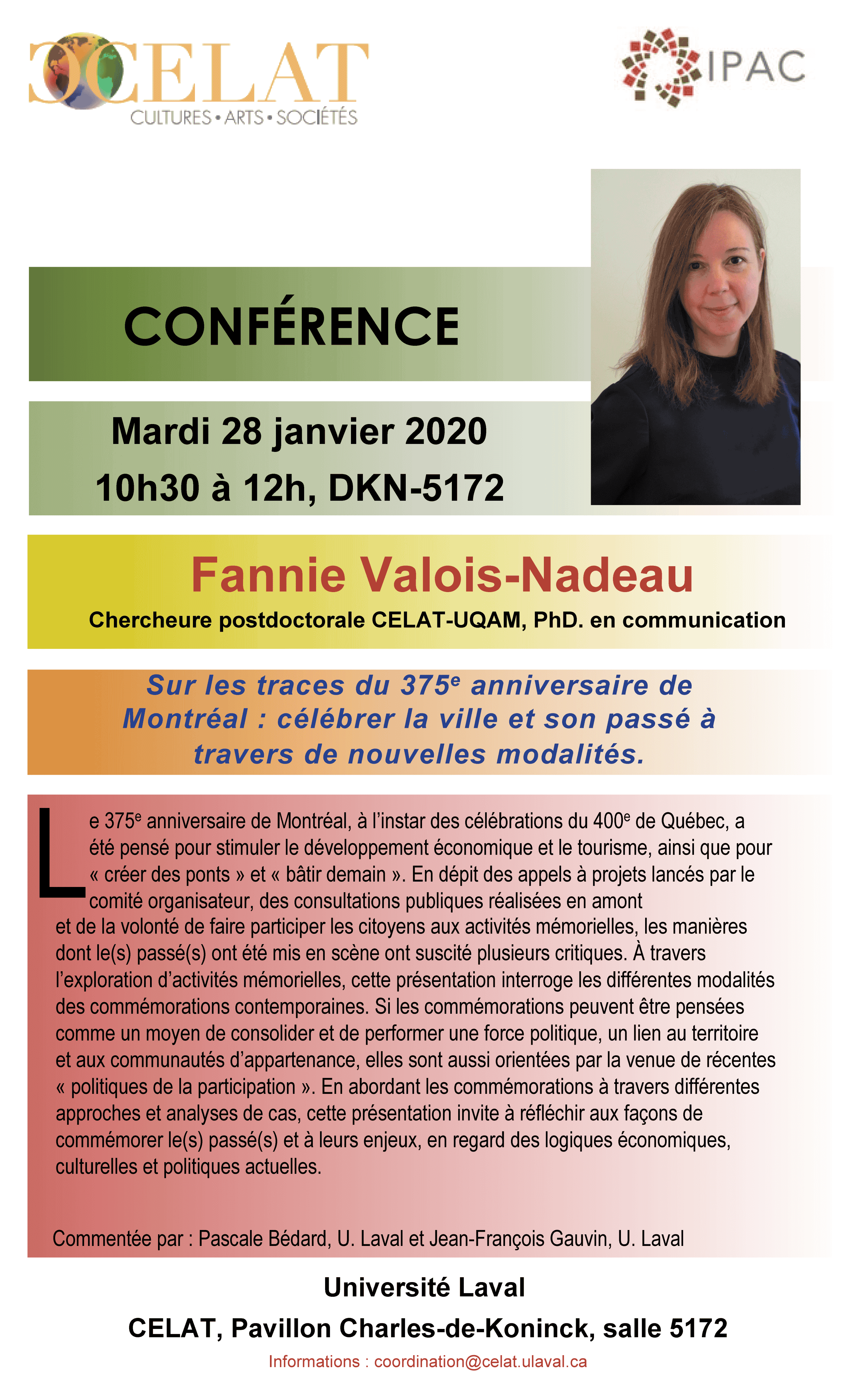 Le mardi 28 janvier 2020, le CELAT vous invite à la conférence de Fanny Valois-Nadeau, chercheure postdoctorale CELAT-UQAM, PhD. en communication : Sur les traces du 375e anniversaire de Montréal : célébrer la ville et son passé à travers de nouvelles modalités. Cette conférence sera commentée par Pascale Bédard, professeure en sociologie de la culture CELAT-UL et Jean-François Gauvin, professeur en muséologie CELAT-UL.