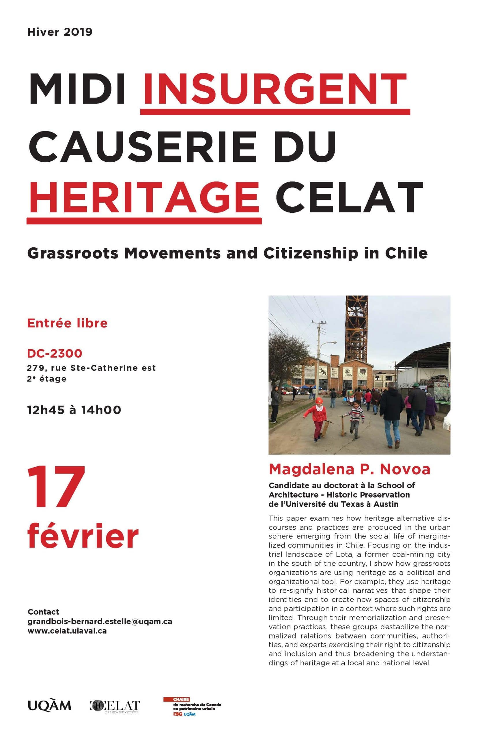 Le CELAT-UQAM est heureux de recevoir Magdalena P. Novoa, Candidate au doctorat à la School of Architecture – Historic Preservation de l’Université du Texas à Austin, pour un midi-causerie sur le thème du patrimoine et des mouvements de revendication citoyens.