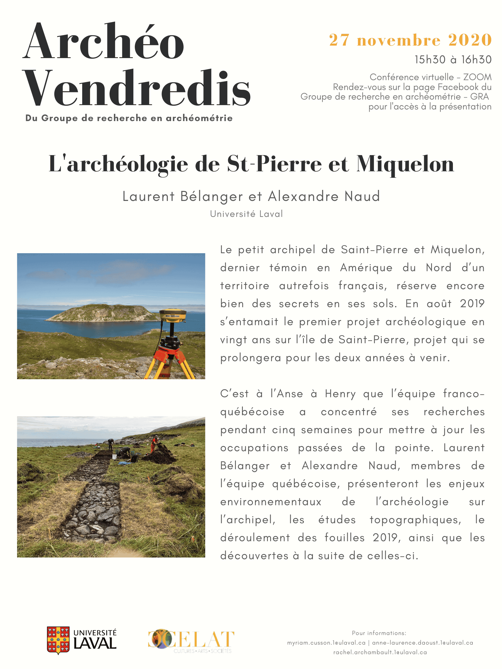 Le prochain Archéo-vendredi portera sur le thème « L’archéologie de St-Pierre et Miquelon », le vendredi 27 novembre 2020 à 15h30. Laurent Bélanger et Alexandre Naud, tous deux affiliés à l’Université Laval, sont les conférenciers invités.