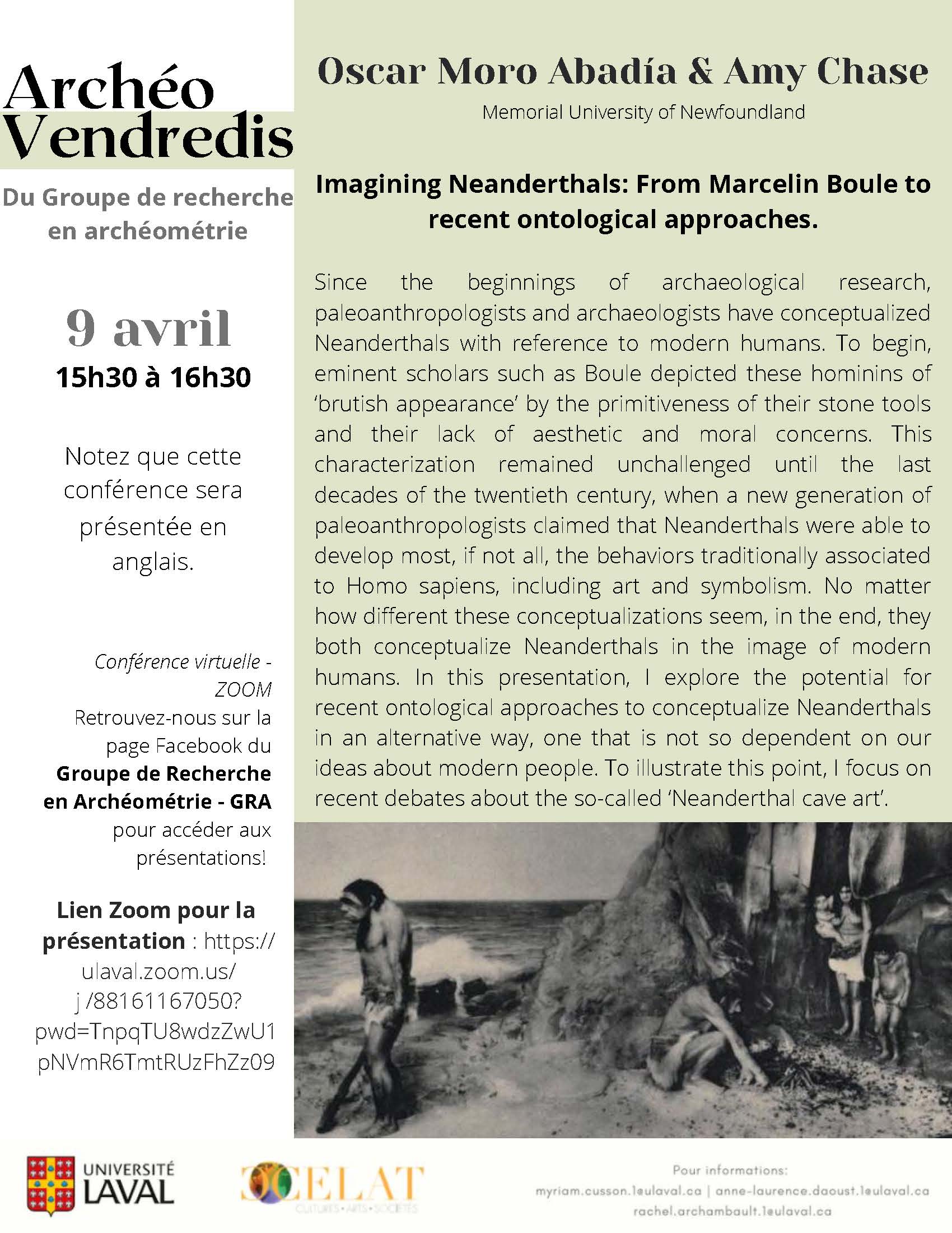 Oscar Moro Abadía et Amy Chase (Memorial University of Newfoundland) présenteront, en anglais, la conférence « Imagining Neanderthals: From Marcelin Boule to Recent Ontological Approaches ». L’activité, prévue sur Zoom le vendredi 9 avril, de 15h30 à 16h30, s’inscrit dans le cadre des Archéo-vendredis.