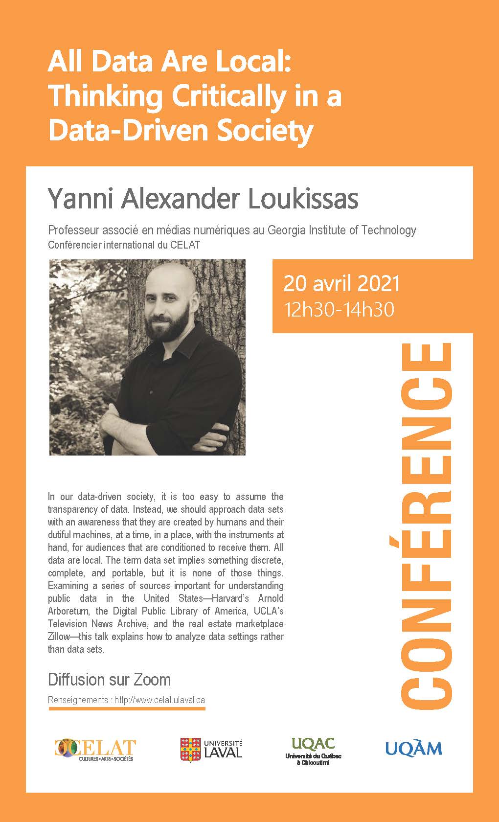 Le CELAT est ravi d’accueillir un conférencier international en mode virtuel ce printemps. Yanni Alexander Loukissas, professeur associé en médias numériques à l’École de littérature, de médias et de communication du Georgia Institute of Technology, présentera le mardi 20 avril 2021, de 12h30 à 14h30, la conférence « All Data Are Local: Thinking Critically in a Data-Driven Society ». Cette présentation, en anglais, s’inscrit dans le sillage de la parution de son ouvrage du même nom en 2019 aux MIT Press.
