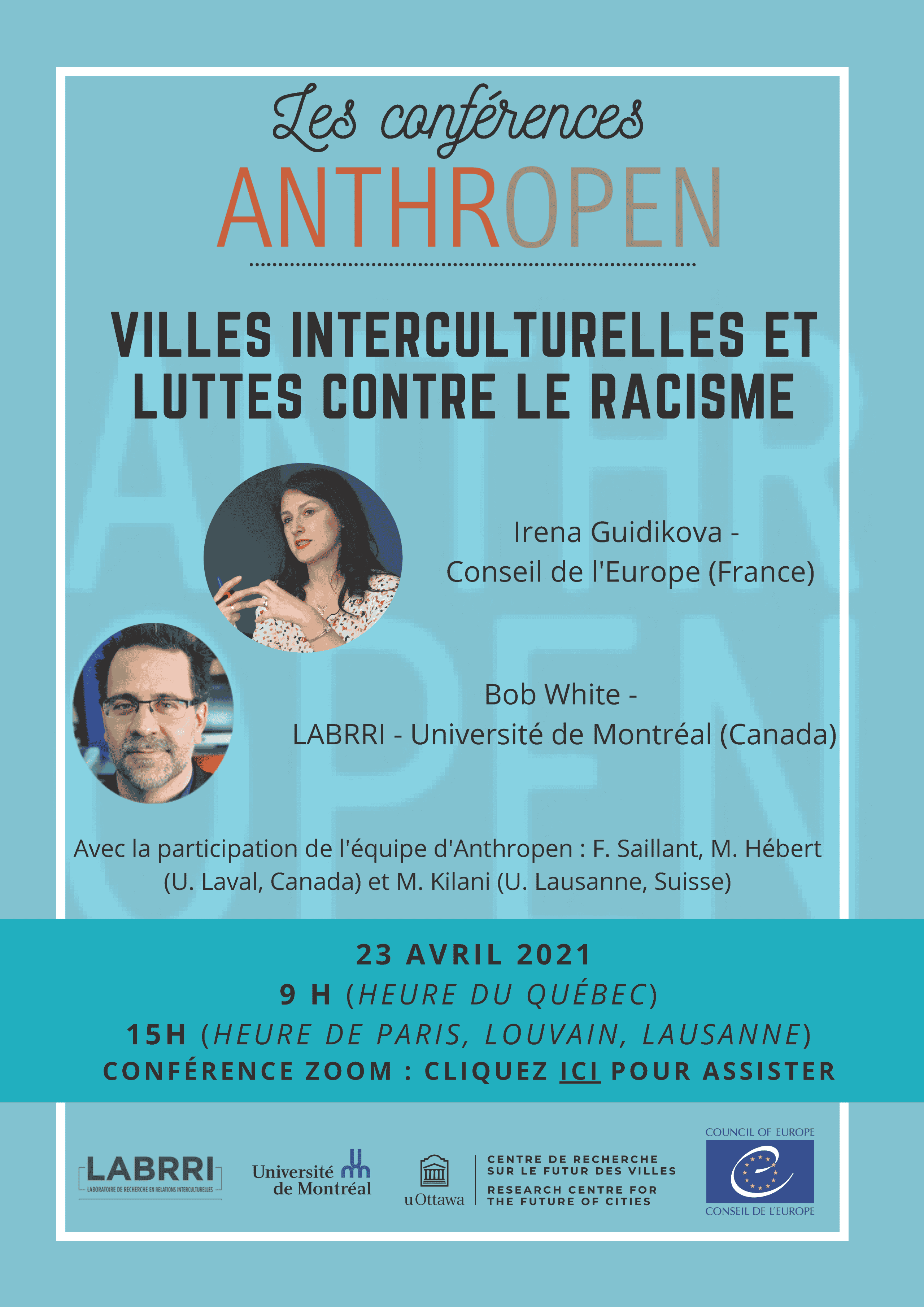 La prochaine conférence Anthropen, intitulée « Villes interculturelles et luttes contre le racisme », aura lieu sur Zoom le vendredi 23 avril 2021 à 9h. À cette occasion, l’équipe d’Anthropen, dont fait partie Francine Saillant (CELAT), accueillera Irena Guidikova (Conseil de l’Europe – France) et Bob White (CELAT).