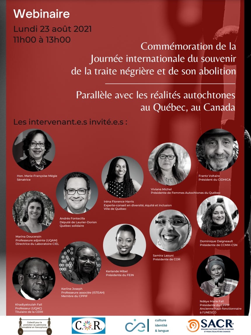 Le Collectif pour la promotion du patrimoine immatériel en francophonie, Corapprochement, le laboratoire CIEL et la Semaine d’actions contre le racisme vous convient, le lundi 23 août, de 11 h à 13 h, au webinaire « Commémoration de la Journée internationale du souvenir de la traite négrière et de son abolition ».