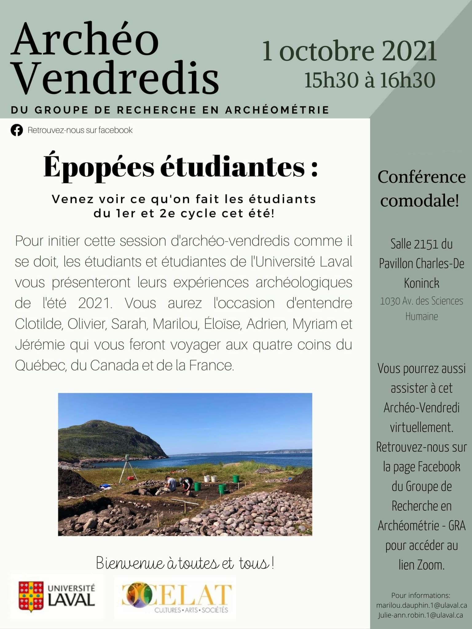 Dans le cadre des Archéo-vendredis, le Groupe de recherche en archéométrie vous invite, le vendredi 1er octobre à 15 h 30, à une rencontre sur le thème « Épopées étudiantes ». Clotilde, Olivier, Sarah, Marilou, Éloïse, Adrien, Myriamet Jérémie présenteront les expériences archéologiques vécues par les étudiant.e.s de l’Université Laval au cours de l’été 2021. L’activité se déroulera au local 2151 du pavillon Charles-De Koninck à l’Université Laval. Un lien Zoom sera également publié le 1er octobre sur la page Facebook du Groupe de recherche en archéométrie.
