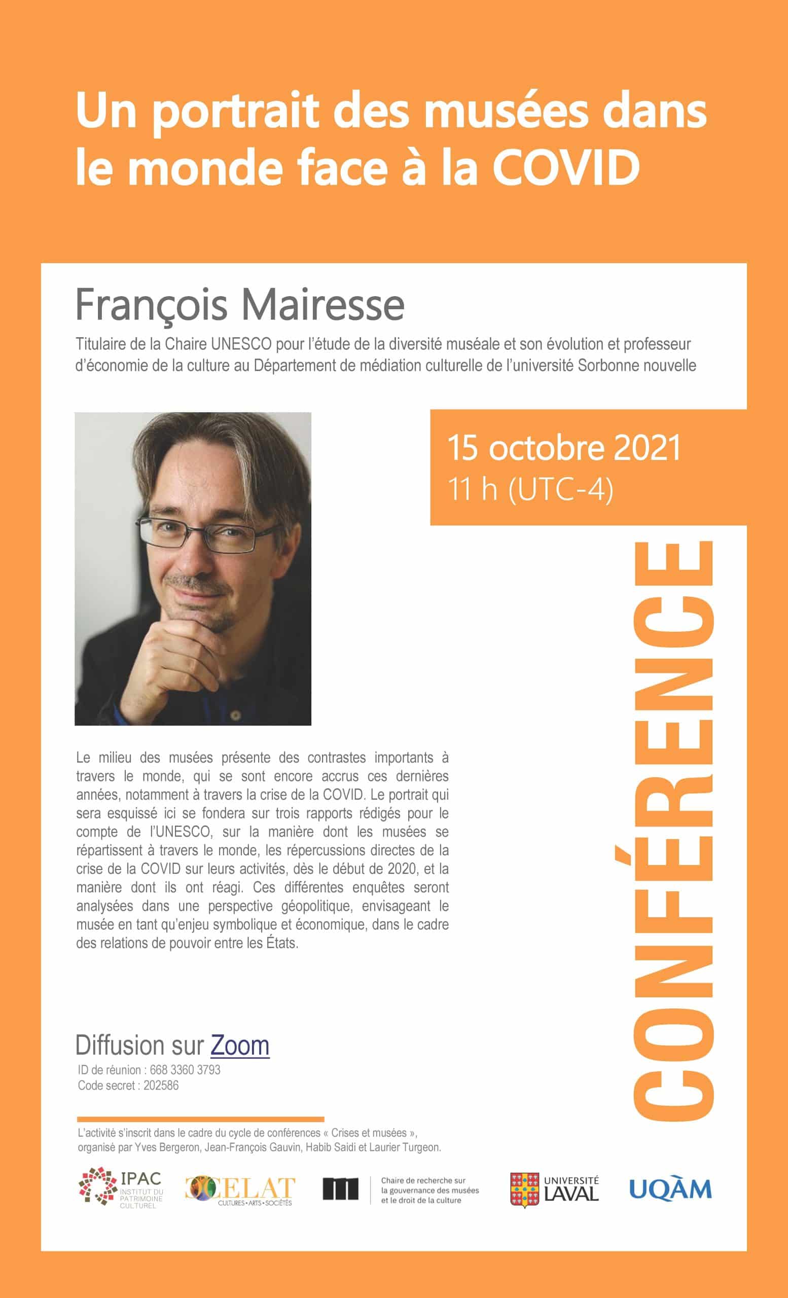 Le vendredi 15 octobre 2021 à 11 h, François Mairesse présentera la conférence virtuelle « Un portrait des musées dans le monde face à la COVID », à laquelle vous invitent l’IPAC, le CELAT et la Chaire de recherche sur la gouvernance des musées et le droit de la culture. Au plaisir de vous y voir en grand nombre!