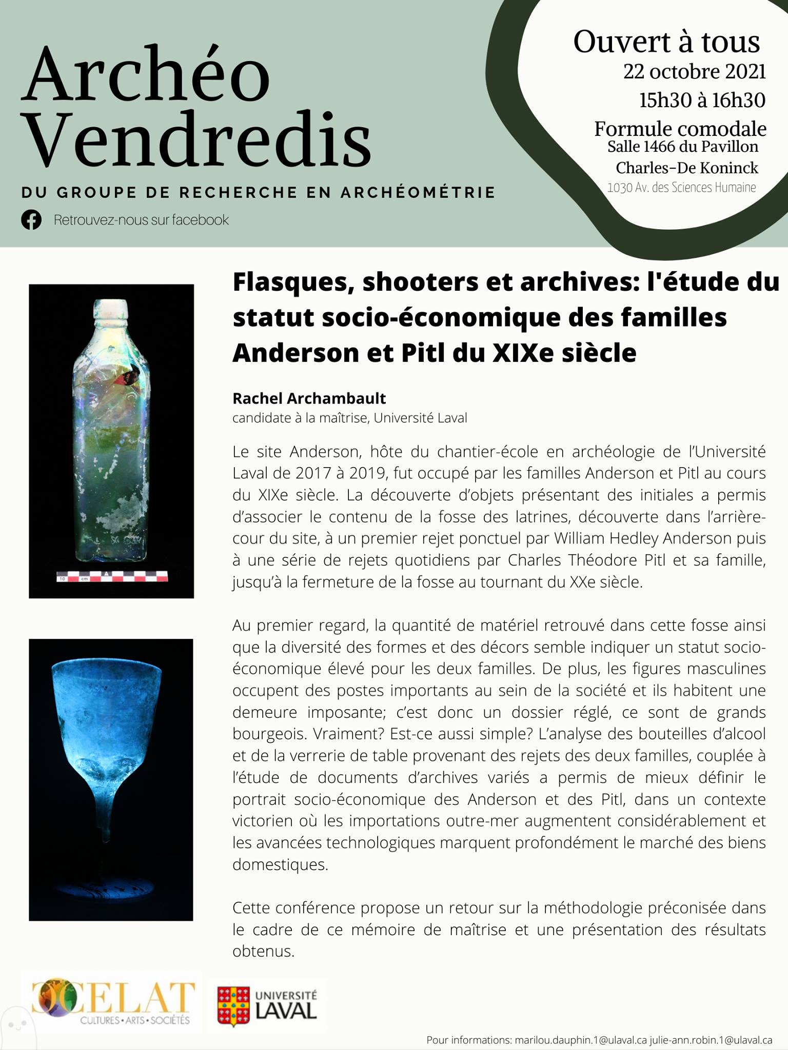 Le vendredi 22 octobre à 15 h 30, Rachel Archambault, membre étudiante du CELAT dirigée par Allison Bain, présentera la conférence « Flasques, shooters et archives : l’étude du statut socio-économique des familles Anderson et Pilt du XIXe siècle ». L’activité se déroulera en formule comodale au local 1466 du pavillon Charles-De Koninck (Université Laval) et sur Zoom. Le lien de la réunion sera publié le jour même sur la page Facebook du Groupe de recherche en archéométrie.