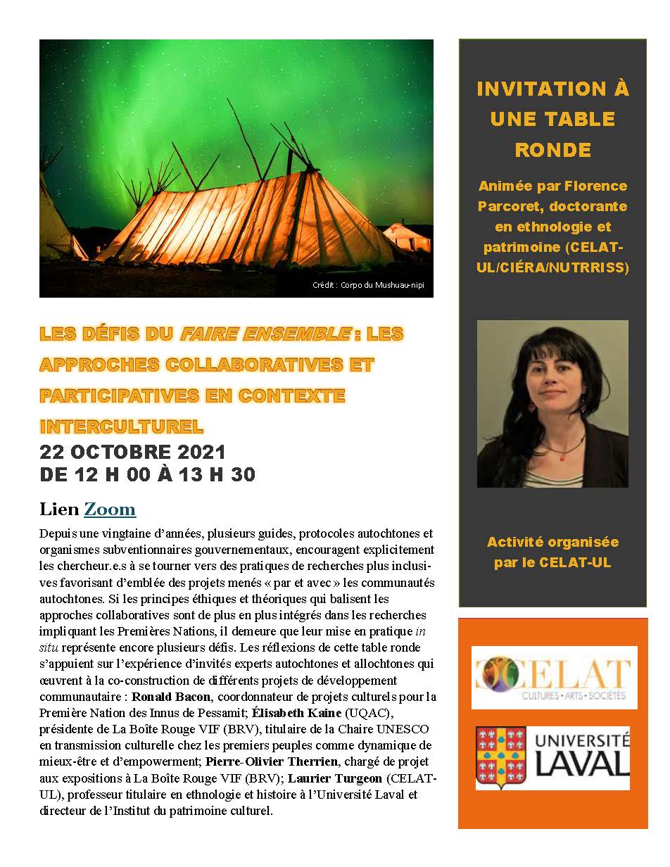 Le CELAT à l’Université Laval vous convie à la table ronde « Les défis du faire ensemble : les approches collaboratives et participatives en contexte interculturel », qui se tiendra le vendredi 22 octobre, de 12 h à 13 h 30, sur Zoom. L’activité est organisée et animée par la doctorante en ethnologie et patrimoine Florence Parcoret (membre étudiante du centre codirigée par Laurier Turgeon), dans le cadre de sa bourse de mi-parcours de 3e cycle du CELAT. « Si les principes éthiques et théoriques qui balisent les approches collaboratives sont de plus en plus intégrés dans les recherches impliquant les Premières Nations, il demeure que leur mise en pratique in situ représente encore plusieurs défis. » Une discussion avec Ronald Bacon, Élisabeth Kaine, Pierre-Olivier Therrien et Laurier Turgeon (CELAT), invité.e.s expert.e.s autochtones et allochtones œuvrant à la coconstruction de projets de développement communautaire, permettra d’éclairer la réflexion sur ces enjeux.