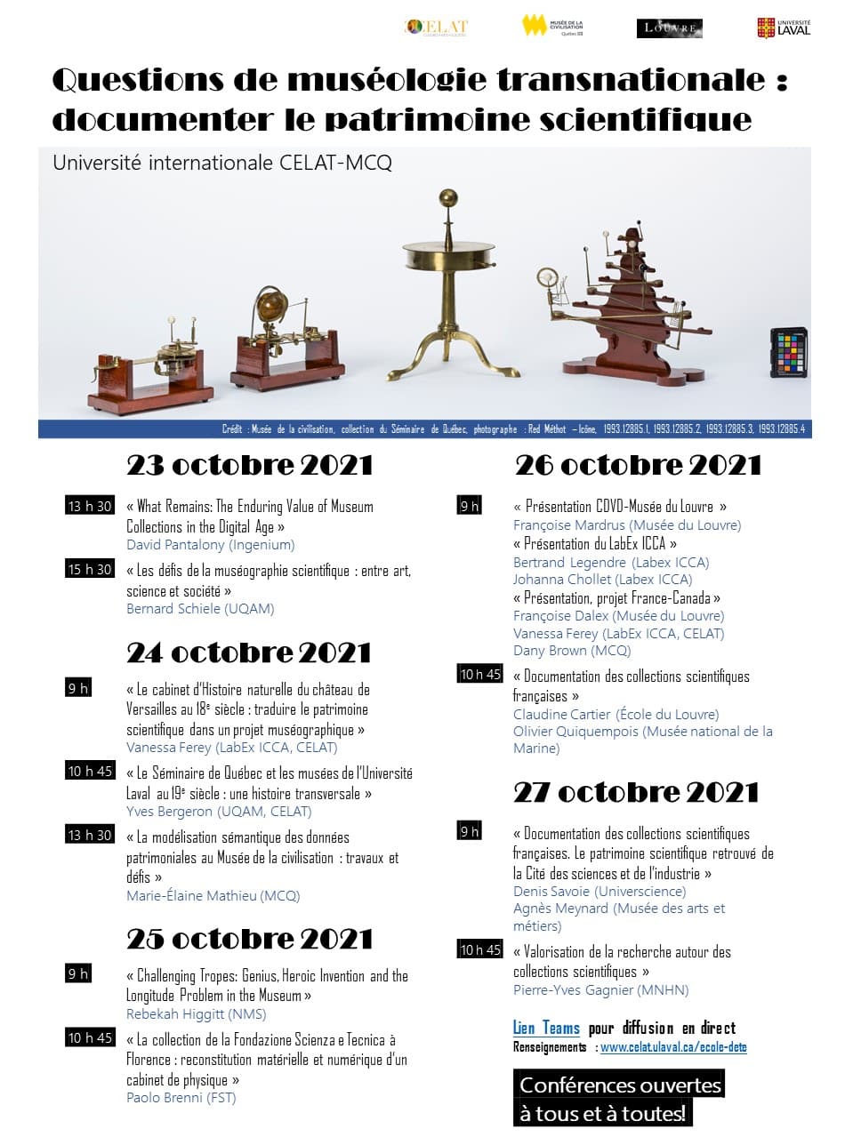 La 9e édition de l’Université internationale CELAT-Musée de la civilisation (MCQ) a pour thème « Documenter le patrimoine scientifique » à travers une approche transnationale. Le redéploiement prochain des collections scientifiques du Séminaire de Québec dans une nouvelle « Maison des sciences » administrée par le Musée de la civilisation met en lumière tous les enjeux derrière la documentation et la mise en valeur des collections scientifiques. Grâce à un partenariat exceptionnel avec le Musée du Louvre, cette édition a pour objectifs de découvrir les défis rencontrés pour documenter adéquatement ces collections, de réfléchir aux questions ontologiques en lien avec cette documentation, de proposer des approches multiples pour comprendre ce patrimoine scientifique, et de partager des savoir-faire spécifiques entre institutions muséales et universitaires française et québécoise. Les participants de cette édition auront l’occasion unique de recevoir une formation, à la fois théorique et pratique, de spécialistes issus du Québec et de la France, et de réaliser un projet de documentation des collections scientifiques.