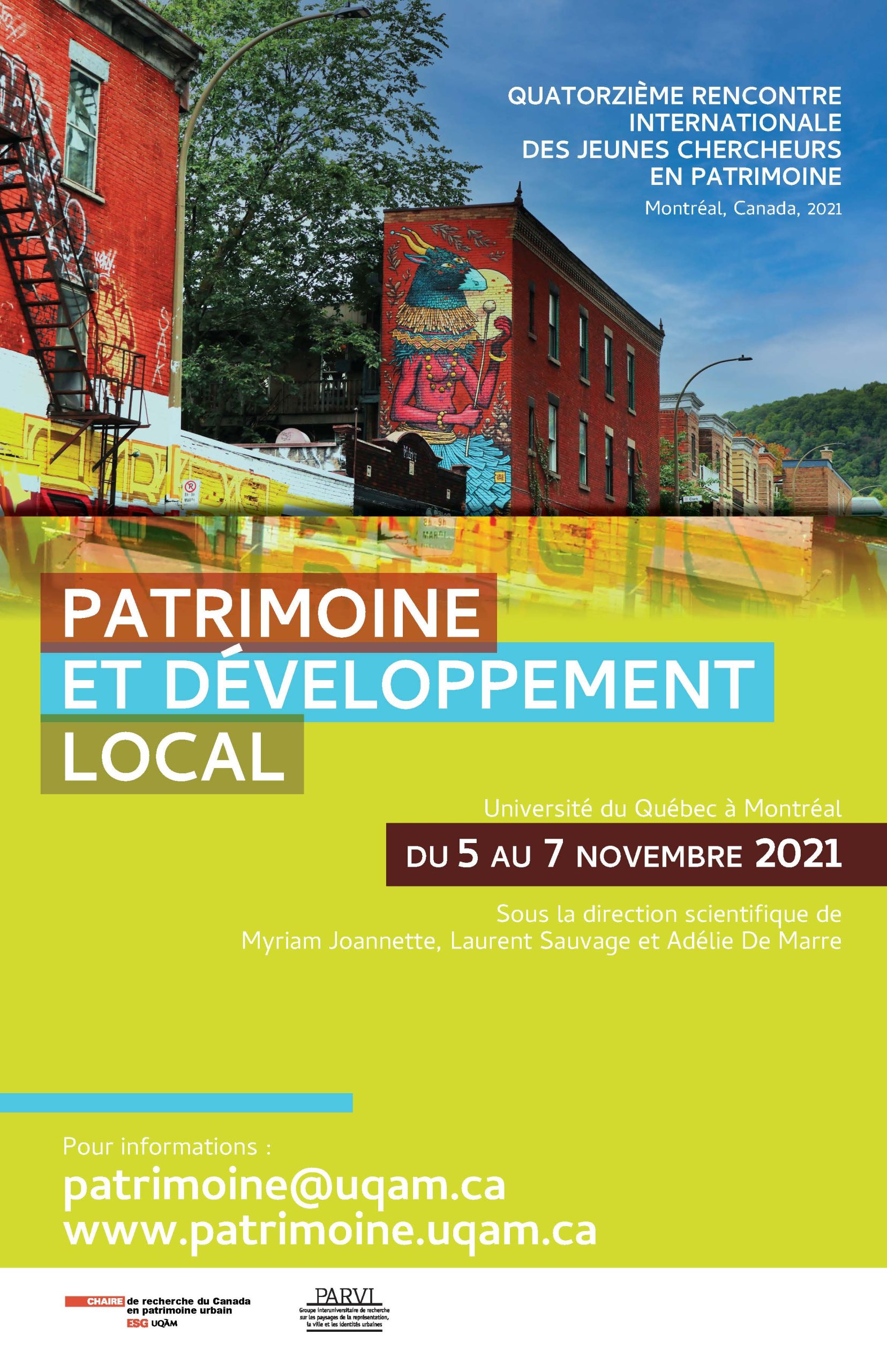 Sur le thème Patrimoine et développement local, la 14e Rencontre internationale des jeunes chercheurs en patrimoine, instiguée par la Chaire de recherche du Canada en patrimoine urbain, se déroulera à l’UQAM du 5 au 7 novembre 2021, sous la direction scientifique de Myriam Joannette (doctorante du CELAT codirigée par Lucie K. Morisset), Laurent Sauvage et Adélie De Marre.
