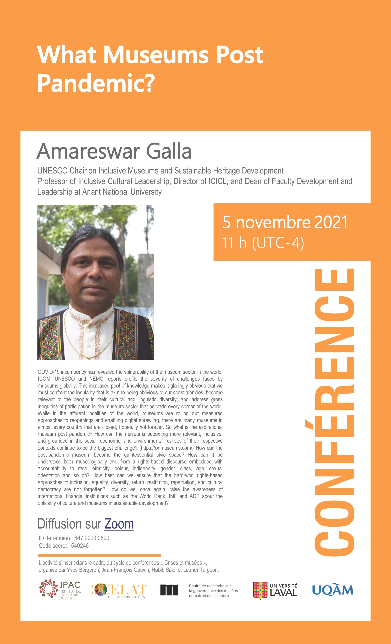 Amareswar Galla (Anant National University) présentera la conférence virtuelle « What Museums Post Pandemic? » le vendredi 5 novembre à 11 h. Cette présentation (en anglais) conclut le cycle de conférences « Crises et musées », organisé par nos membres Yves Bergeron, Jean-François Gauvin, Habib Saidi et Laurier Turgeon, sous l’égide de l’IPAC, du CELAT et de la Chaire de recherche sur la gouvernance des musées et le droit de la culture.