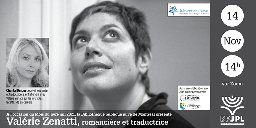 Chantal Ringuet, membre associée du CELAT, s’entretiendra sur Zoom le dimanche 14 novembre à 14 h avec Valérie Zenatti, romancière et traductrice invitée dans le cadre du Mois du livre juif 2021 organisé par la Bibliothèque publique juive de Montréal.