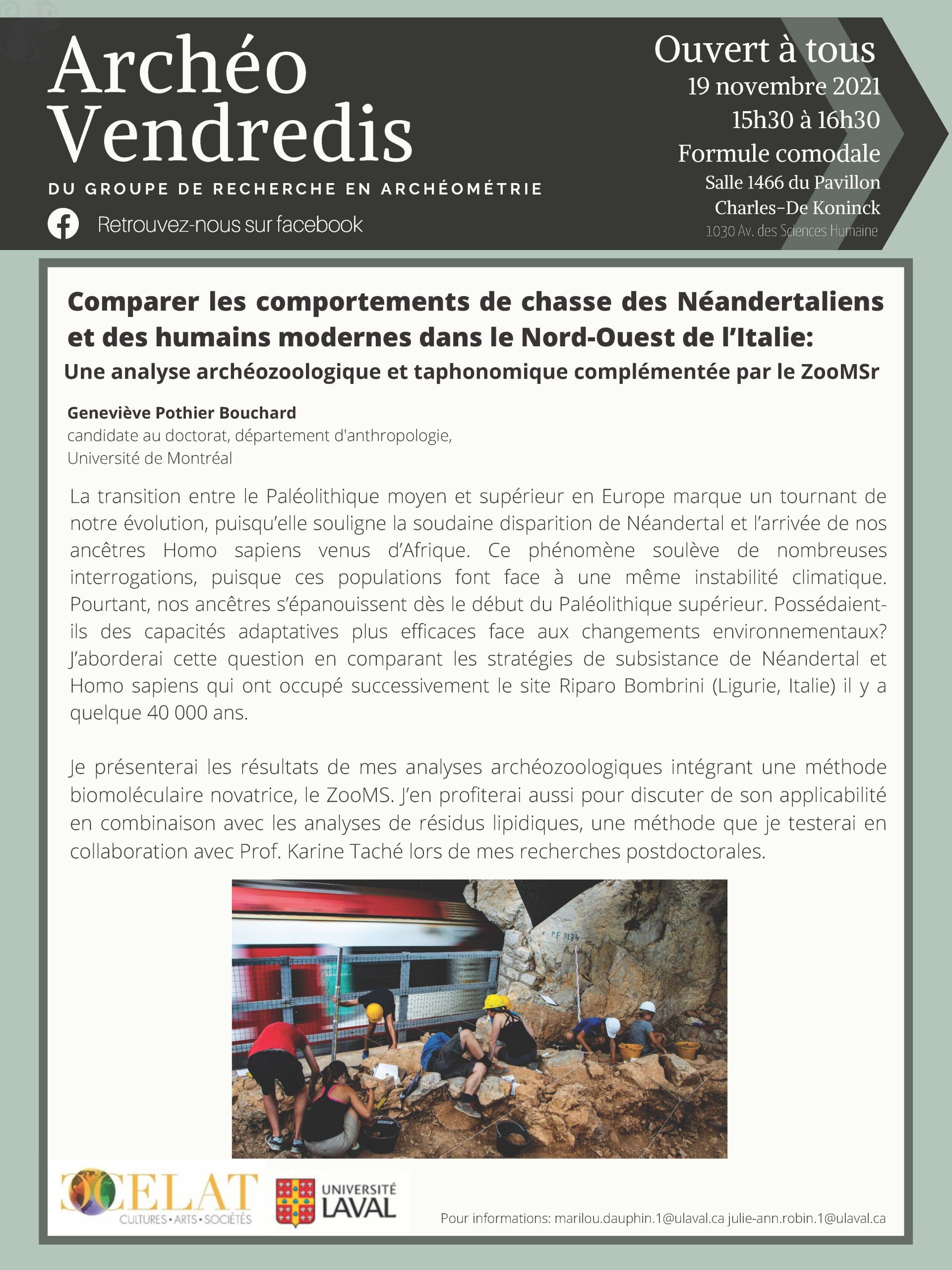 À l’occasion des Archéo-vendredis, Geneviève Pothier Bouchard (Université de Montréal) présentera la conférence « Comparer les comportements de chasse des Néandertaliens et des humains modernes dans le nord-ouest de l’Italie : une analyse archéozoologique et taphonomique complémentée par le ZooMSr ».