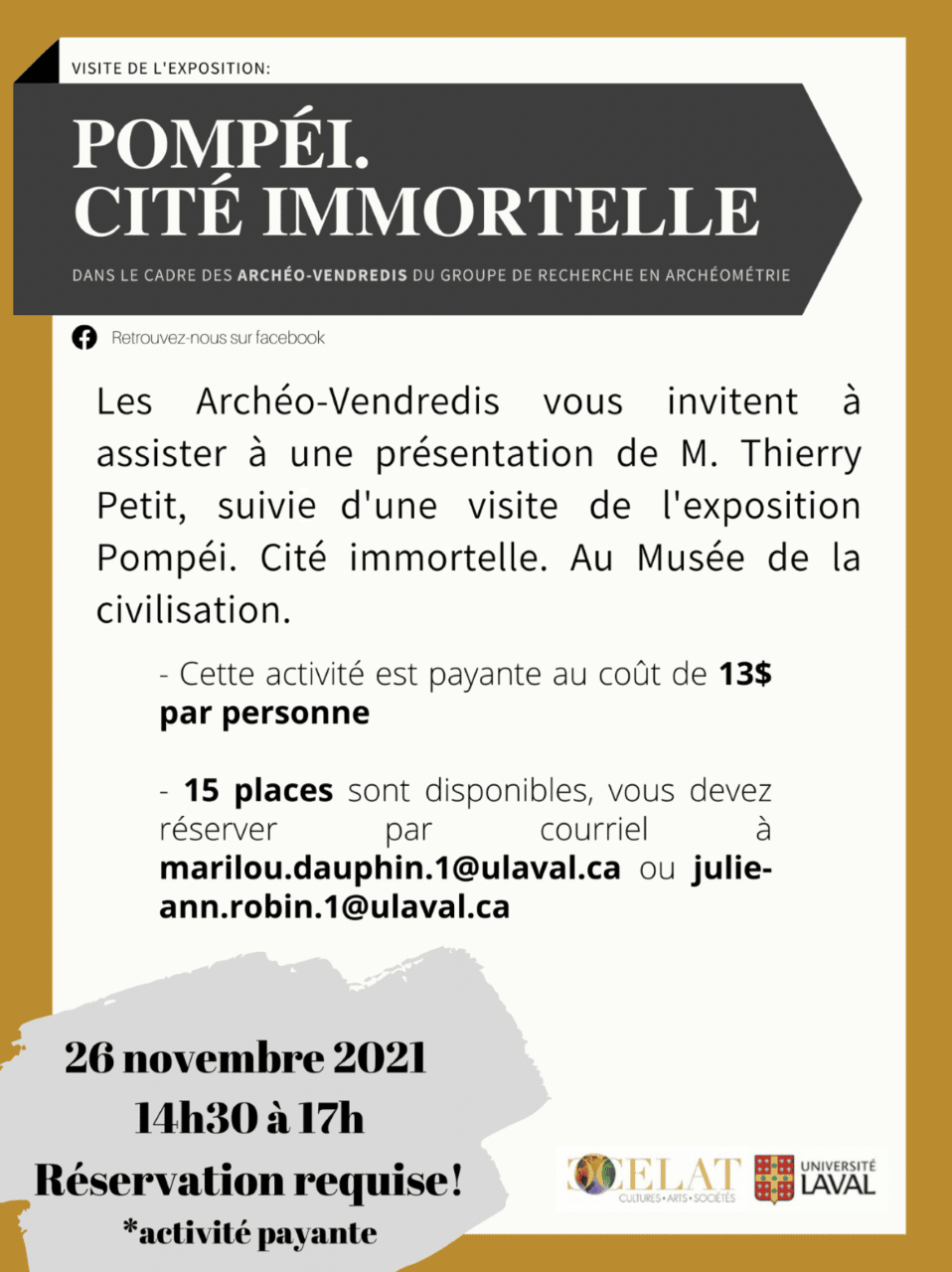 Une activité spéciale se déroulera le vendredi 26 novembre 2021, de 14 h 30 à 17 h, au Musée de la civilisation dans le cadre des Archéo-vendredis. À la suite d’une présentation de Thierry Petit, professeur au Département des sciences historiques de l’Université Laval, se tiendra une visite de l’exposition Pompéi. Cité immortelle.