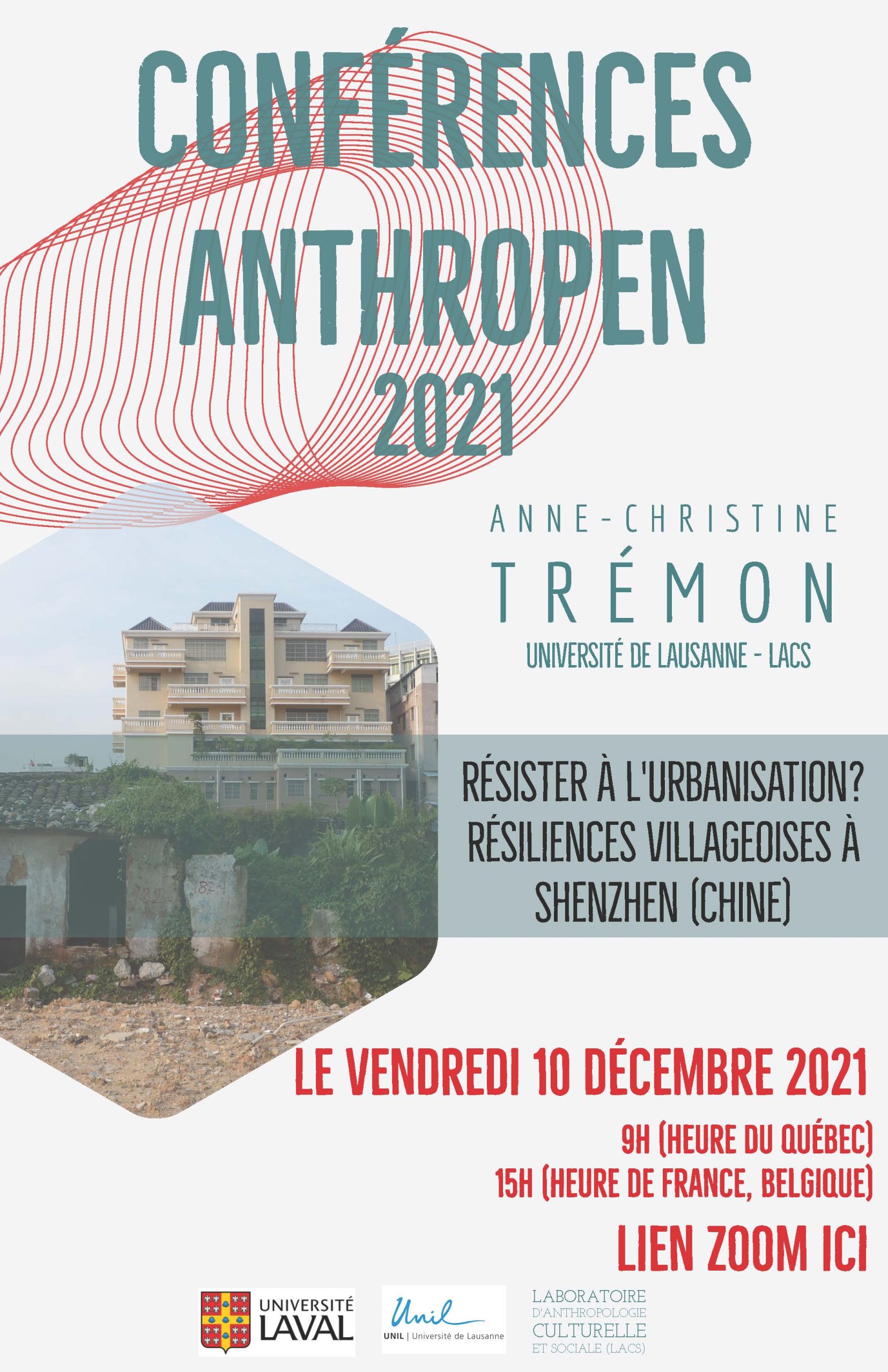 Ce vendredi 10 décembre à 9 h, l’équipe d’Anthropen (dont fait partie notre membre émérite Francine Saillant) vous invite à assister à la conférence « Résister à l’urbanisation? Résiliences villageoises à Shenzhen (Chine) », présentée sur Zoom par Anne-Christine Trémon (Université de Lausanne – LACS). L’activité inaugure le cycle des conférences Anthropen 2021-2022.
