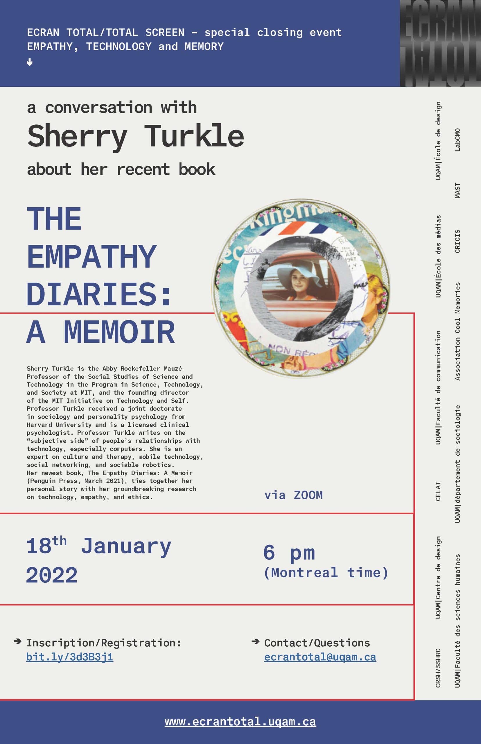 En clôture des activités d’ÉCRAN TOTAL, vous êtes invité.e.s à une discussion virtuelle avec Sherry Turkle (MIT) autour de son récent ouvrage The Empathy Diaries: A Memoir (Penguin Press, 2021) le mardi 18 janvier à 18 h. Katharina Niemeyer (CELAT) et Ola Siebert, membre étudiante du centre sous sa direction, prendront part à cet événement dont le CELAT est partenaire. Inscription à la réunion Zoom requise.