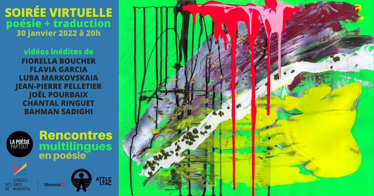 « À travers sept vidéos inédites, réalisées par des poètes, traducteurs et traductrices, cette soirée virtuelle donne à entendre des poèmes interprétés par ceux et celles qui les ont écrits (en français, en espagnol, en guaraní), ceux et celles qui les ont traduits (du chinook, de l’espagnol, du farsi, du russe, du yiddish, ou vers le luxembourgeois) et parfois même par les deux (depuis Buenos Aires, Gatineau, Laval, Montevideo et Montréal ». L’activité, à laquelle prendront part Fiorella Boucher, Flavia Garcia, Luba Markovskaia, Jean-Pierre Pelletier, Joël Pourbaix, Chantal Ringuet (CELAT) et Bahman Sadighi, sera diffusée sur la page Facebook et la chaîne YouTube de La poésie partout.
