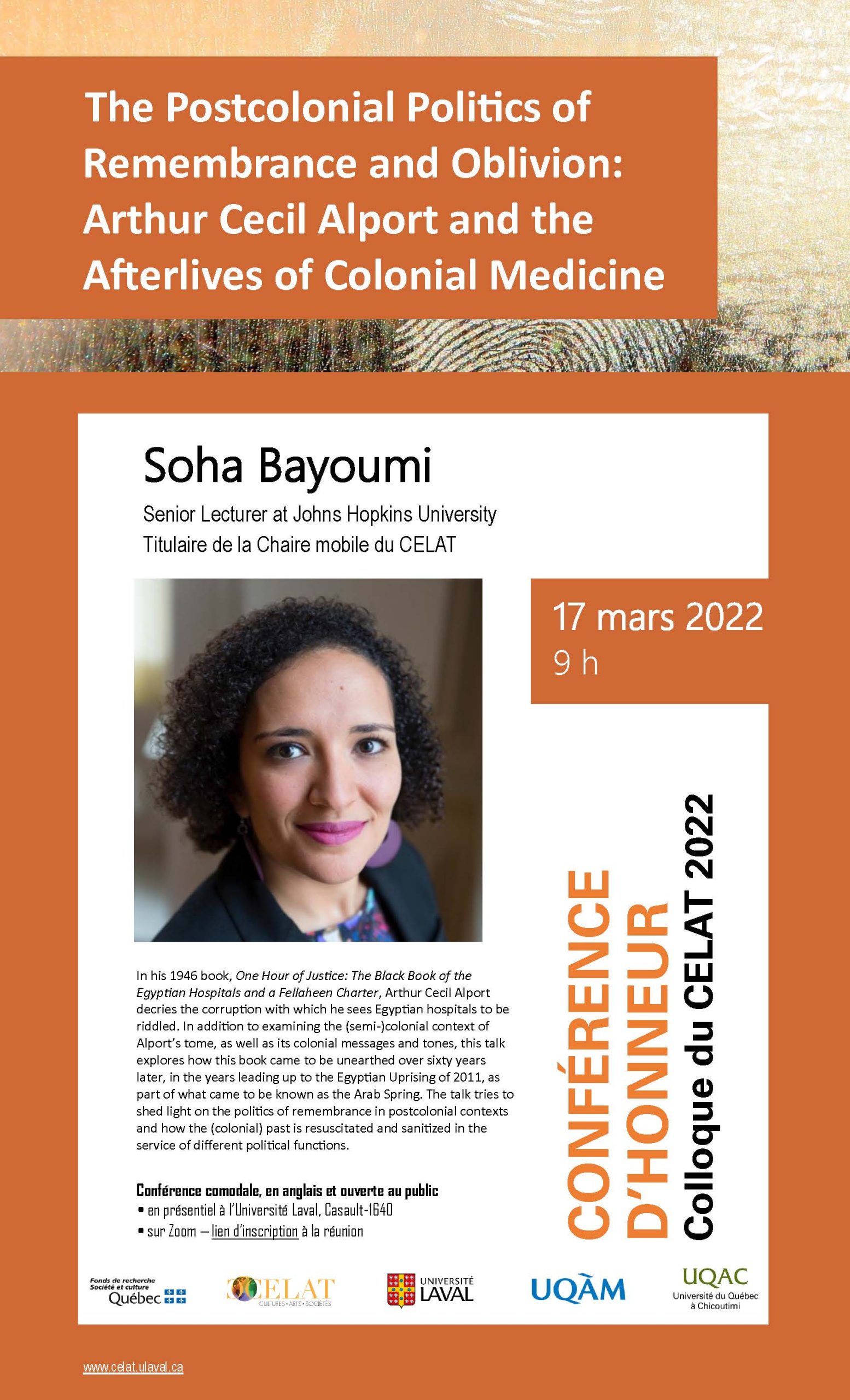 Le Centre de recherche Cultures – Arts – Sociétés a le plaisir de convier le public à la conférence inaugurale de son colloque 2022, qui sera présentée en anglais par Soha Bayoumi (Université Johns Hopkins), titulaire de la Chaire mobile du CELAT. Intitulée « The Postcolonial Politics of Remembrance and Oblivion: Arthur Cecil Alport and the Afterlives of Colonial Medicine », la conférence comodale se déroulera le jeudi 17 mars 2022 à 9 h à l’Université Laval (pavillon Louis-Jacques-Casault, salle 1640) et sur Zoom.