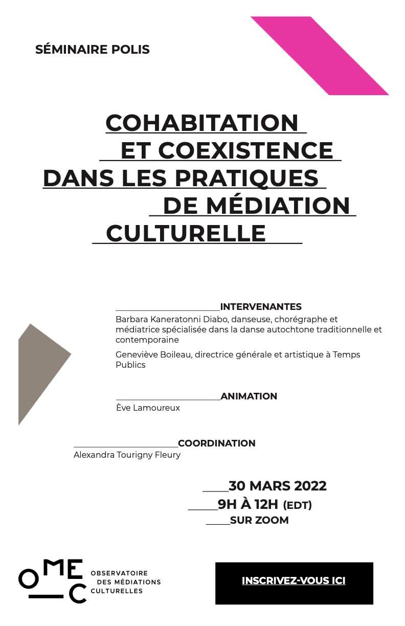 Le mercredi 30 mars, de 9 h à 12 h, l’Observatoire des médiations culturelles (OMEC) vous convie à son prochain séminaire virtuel de l’axe Polis, intitulé « Cohabitation et coexistence dans les pratiques de médiation culturelle ». La discussion, animée par Ève Lamoureux (CELAT) et coordonnée par Alexandra Tourigny Fleury (membre étudiante du CELAT sous sa direction), rassemblera Barbara Kaneratonni Diabo (danseuse, chorégraphe et médiatrice spécialisée dans la danse autochtone traditionnelle et contemporaine) et Geneviève Boileau (directrice générale et artistique de Temps publics). Le séminaire cherche à initier une réflexion sur « les pratiques, les espaces et les imaginaires de la cohabitation dans les médiations culturelles, en vue » du prochain Symposium international de l’OMEC, prévu en juin 2022.