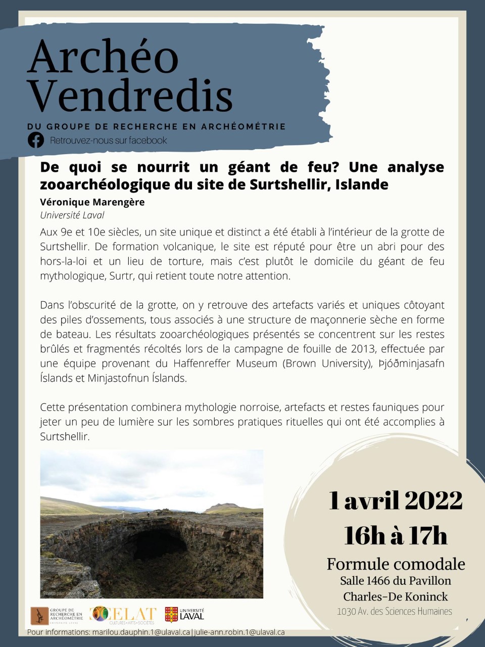 Véronique Marengère présentera la conférence comodale « De quoi se nourrit un géant de feu? Une analyse zooarchéologique du site de Surtshellir, Islande » ce vendredi 1er avril à 16 h. L’activité, qui s’inscrit dans le cadre des Archéo-vendredis, se déroulera au local 1466 du pavillon Charles-De Koninck (Université Laval) et sur Zoom.