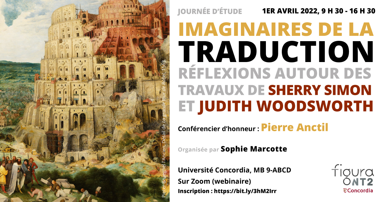 Organisée par Sophie Marcotte, la journée d’étude comodale Imaginaires de la traduction – Réflexions autour des travaux de Sherry Simon et Judith Woodsworth se déroulera le vendredi 1er avril 2022 à l’Université Concordia (salle MB 9-ABCD). Pierre Anctil (CELAT) présentera à 9 h 45 la conférence d’honneur « Sous le regard de l’aigle : la presse yiddish de Montréal observe le Canada français des années 1930 ». Inscription requise pour assister à la journée sur Zoom.