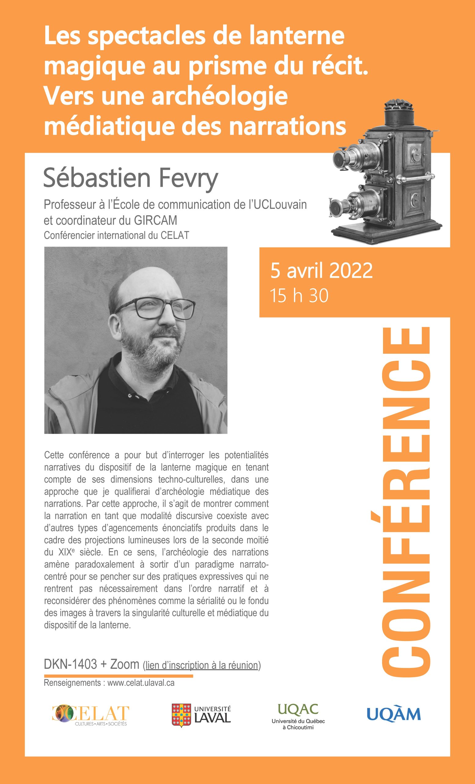 Le CELAT est heureux d’accueillir ce printemps un conférencier international; Sébastien Fevry (Université catholique de Louvain) fera une présentation intitulée « Les spectacles de lanterne magique au prisme du récit. Vers une archéologie médiatique des narrations » le mardi 5 avril à 15 h 30. En formule comodale, l’activité se tiendra en ligne et au CELAT à l’Université Laval (pavillon Charles-De Koninck, salle 1403 – places limitées en présentiel).