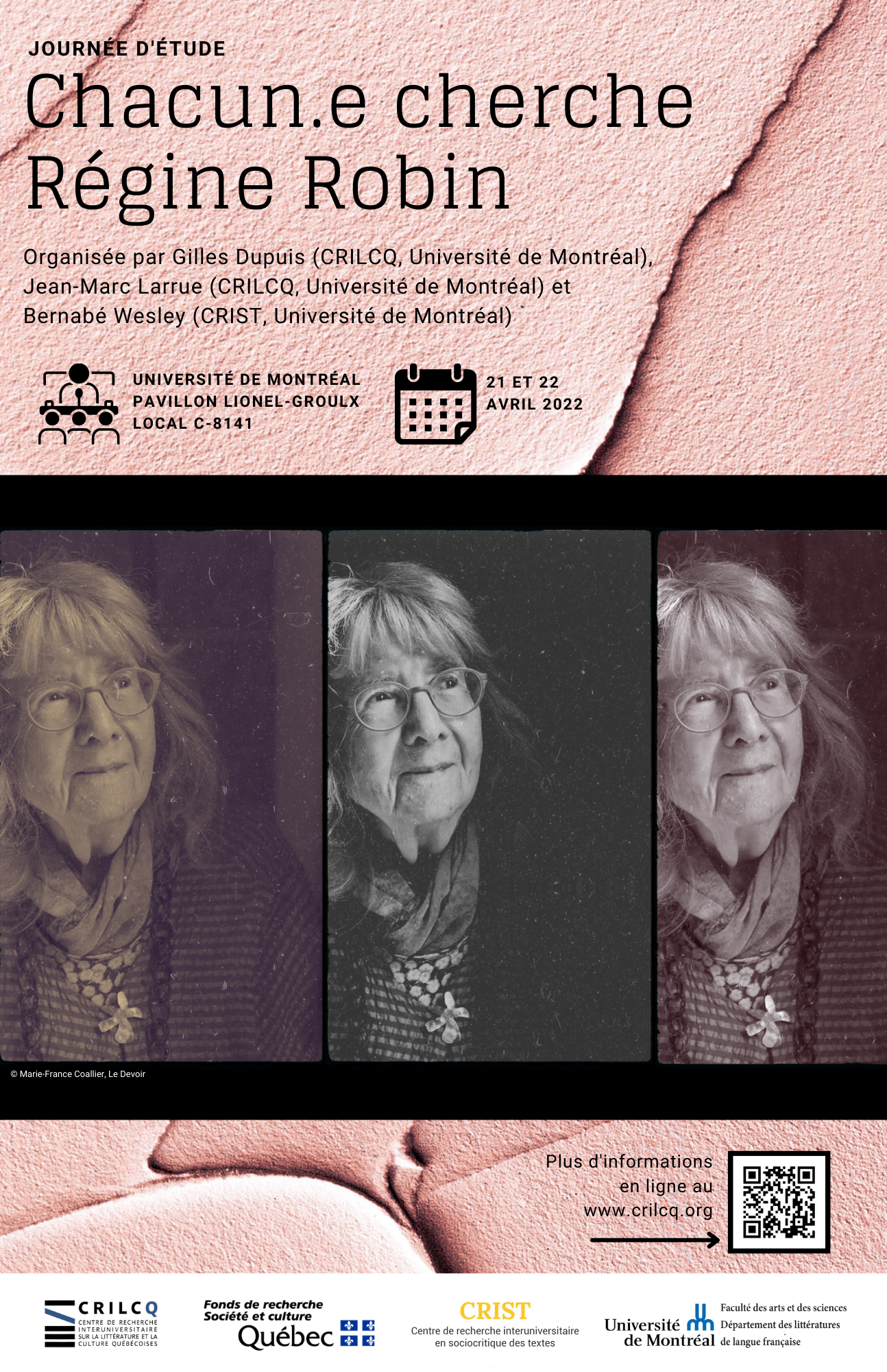 Organisées par Jean-Marc Larrue, Gilles Dupuis et Barnabé Wesley, les journées d’étude Chacun.e cherche Régine Robin, consacrées à l’oeuvre de feue Régine Robin, membre émérite du CELAT, se tiendront les 21 et 22 avril au CRILCQ à l’Université de Montréal (pavillon Lionel-Groulx, local C-8141). On compte parmi les intervenant.e.s nos membres Marc Angenot et Simon Harel.