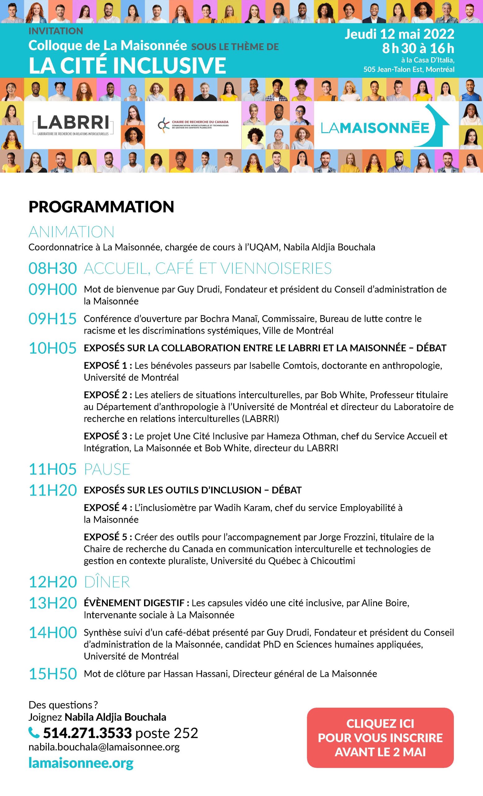 Le LABRRI et la Chaire de recherche du Canada en communication interculturelle et technologies de gestion en contexte pluraliste vous invitent à assister au colloque annuel de La Maisonnée, qui se déroulera le jeudi 12 mai 2022 à la Casa d’Italia (Montréal) sur le thème La cité inclusive. Notre membre Bob White et nos membres étudiant.e.s Isabelle Comtois et Guy Drudi, qui travaillent sous sa direction, participent à l’événement.