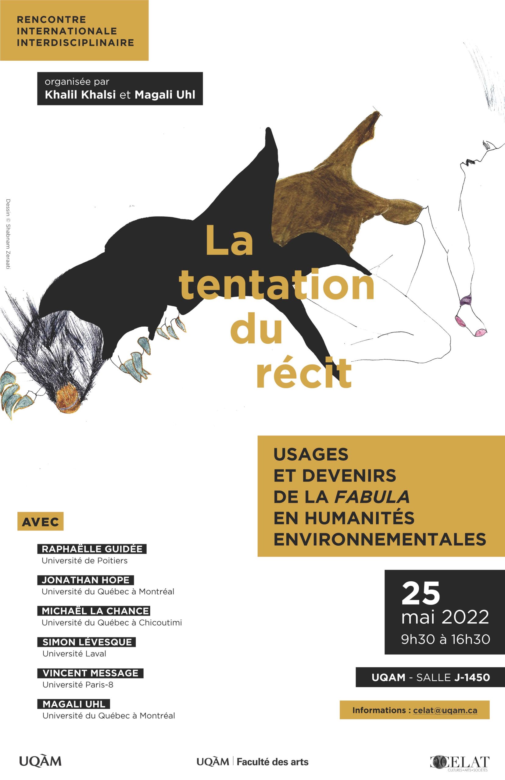 Vous êtes invité.e.s à la rencontre internationale interdisciplinaire La tentation du récit. Usages et devenirs de la fabula en humanités environnementales, qui se tiendra à l’UQAM (salle J-1450) le mercredi 25 mai 2022 dès 9 h 30. Organisée par Khalil Khalsi (CELAT) et Magali Uhl (CELAT), l’activité rassemblera plusieurs membres de notre centre. La rencontre sera diffusée en direct sur la chaîne YouTube du CELAT.
