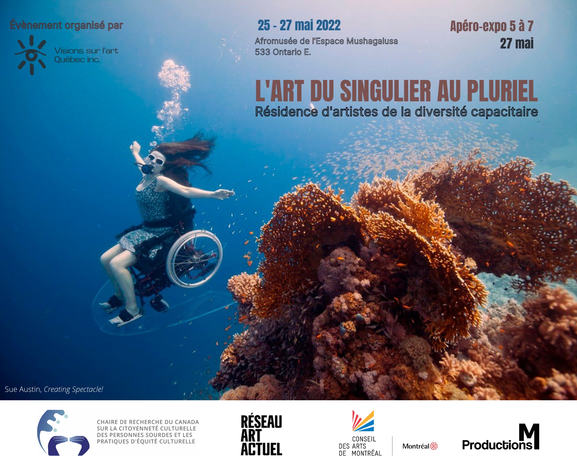 Organisée par Géatane Cummings et Véronique Leduc (CELAT), la résidence d’artistes L’art du singulier au pluriel se veut un espace propice aux rencontres, aux échanges, à la réflexion et à la création pour 10 artistes de la diversité capacitaire. Elle est financée par le Conseil des arts de Montréal et coorganisée par Visions sur l’Art Québec et la Chaire de recherche du Canada sur la citoyenneté culturelle des personnes sourdes et les pratiques d’équité culturelle. La résidence se déroulera à l’Afromusée du 25 au 27 mai, et se terminera, le 27 mai dès 17h, par un cinq à sept ouvert au public.