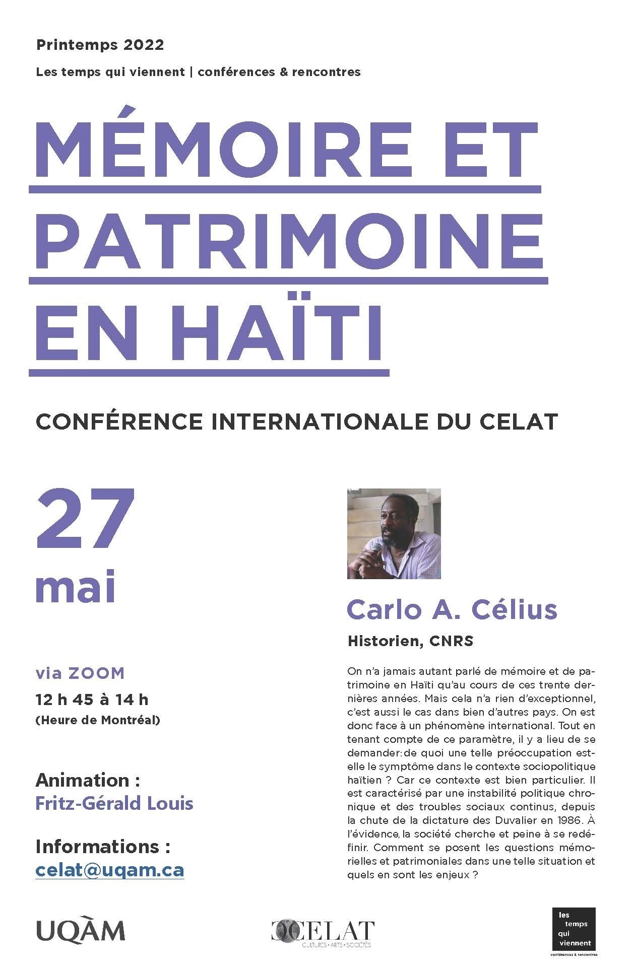 Dans le cadre de la série « Les temps qui viennent », Carlo A. Célius présentera sur Zoom la conférence internationale « Mémoire et patrimoine en Haïti » le vendredi 27 mai, de 12 h 45 à 14 h. L’activité sera animée par notre membre étudiant Fritz-Gérald Louis (doctorant sous la direction d’Yves Bergeron).