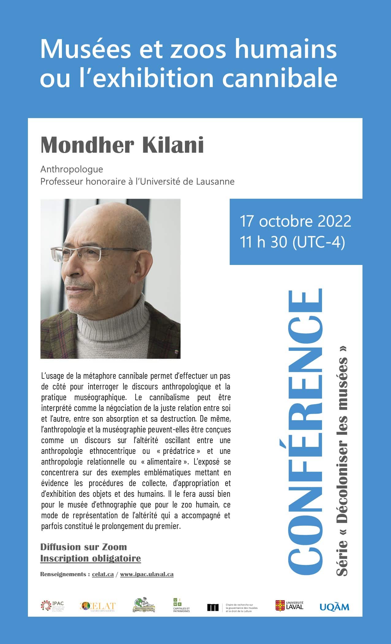 Le lundi 17 octobre 2022 à 11 h 30 (UTC-4), l’anthropologue Mondher Kilani (Université de Lausanne) présentera sur Zoom la conférence « Musées et zoos humains ou l’exhibition cannibale », dans le cadre de la série « Décoloniser les musées », organisée par nos membres Yves Bergeron, Jean-François Gauvin, Habib Saidi et Laurier Turgeon. L’activité est présentée par le CELAT, l’IPAC, la Chaire CLE en muséologie et mise en public, l’UMR Capitales et patrimoines et la Chaire de recherche sur la gouvernance des musées et le droit de la culture. Bienvenue à tous et à toutes!