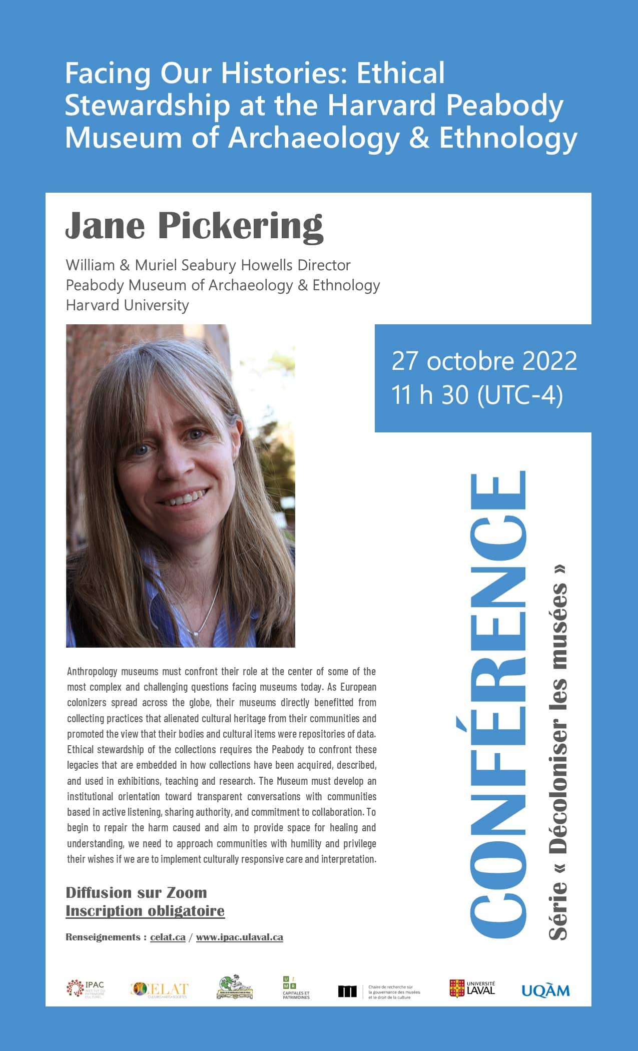 Le CELAT et ses partenaires vous invitent à assister à la conférence « Facing Our Histories: Ethical Stewardship at the Harvard Peabody Museum of Archaeology & Ethnology », qui sera présentée sur Zoom par Jane Pickering (Peabody Museum, Université Harvard) le jeudi 27 octobre à 11 h 30 (UTC-4). L’activité s’inscrit dans la série de conférences « Décoloniser les musées », sous la direction de nos membres Yves Bergeron, Jean-François Gauvin, Habib Saidi et Laurier Turgeon. Au plaisir de vous y voir!