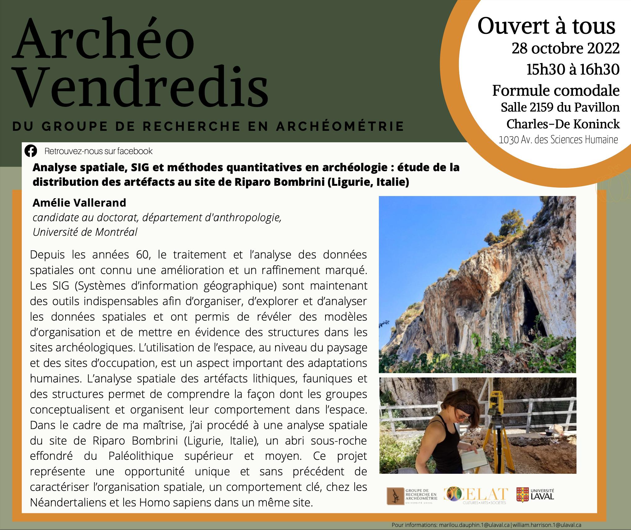 Ce vendredi 28 octobre dès 15 h 30, Amélie Vallerand (Université de Montréal) présentera la conférence « Analyse spatiale, SIG et méthodes quantitatives en archéologie : étude de la distribution des artéfacts au site de Riparo Bombrini (Ligurie, Italie) » dans le cadre des Archéo-vendredis, organisés par le Groupe de recherche en archéométrie. En formule comodale, l’évènement se tiendra au local 2159 du pavillon Charles-De Koninck et sur Zoom.