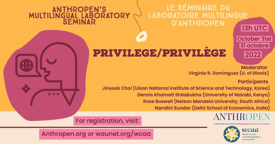 La première séance des séminaires 2022-2023 du Laboratoire multilingue d’Anthropen et du WCAA, prévue le lundi 31 octobre à 13 h (UTC), portera sur le thème du privilège. Les participant-es se demanderont « qui a un privilège dans une ou plusieurs sociétés, quelles sont les conséquences de ce privilège et dans quels domaines ce privilège est pertinent ». Animée par Virginia R. Dominguez (U. of Illinois), la table ronde rassemblera Jinsook Choi (Ulsan National Institute of Science and Technology, Korea), Dennis Khamati Shilabukha (University of Nairobi, Kenya), Rose Boswell (Nelson Mandela University, South Africa) et Nandini Sundar (Delhi School of Economics, India).