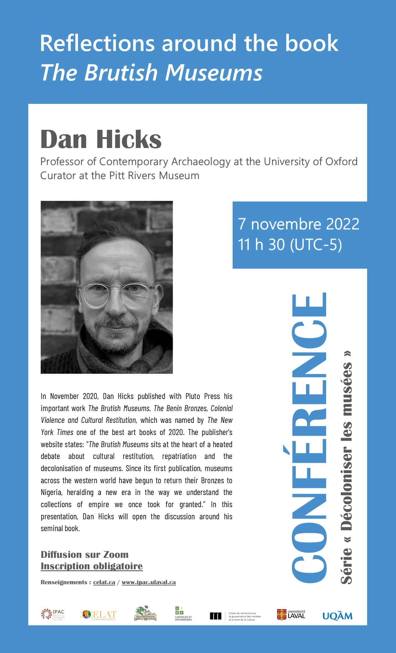 Dan Hicks (University of Oxford, Pitt Rivers Museum) prononcera en anglais une conférence autour de son remarquable ouvrage The Brutish Museums (Pluto Press, 2020) le lundi 7 novembre à 11 h 30 (UTC-5), dans le cadre de la série « Décoloniser les musées », présentée par le CELAT et ses partenaires. À ne pas manquer!