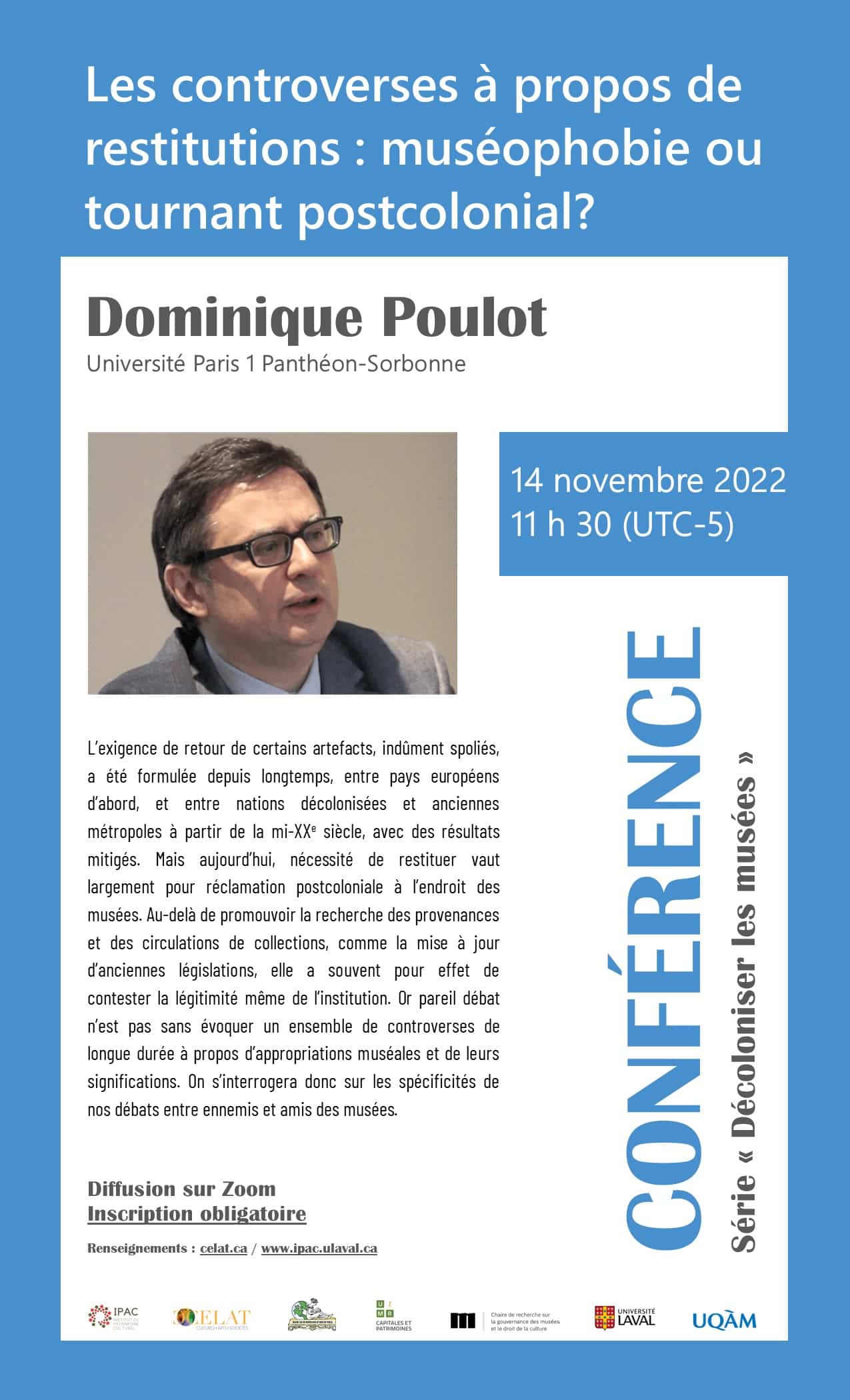 Dans le cadre de la série « Décoloniser les musées », vous êtes invité-es à assister à la conférence « Les controverses à propos de restitutions : muséophobie ou tournant postcolonial? » que Dominique Poulot (Université Paris 1 Panthéon-Sorbonne) présentera sur Zoom le lundi 14 novembre à 11 h 30 (UTC-5). L’activité est présentée par le CELAT, l’IPAC, la Chaire CLE en muséologie et mise en public, l’UMR Capitales et patrimoines et la Chaire de recherche sur la gouvernance des musées et le droit de la culture. À ne pas manquer!