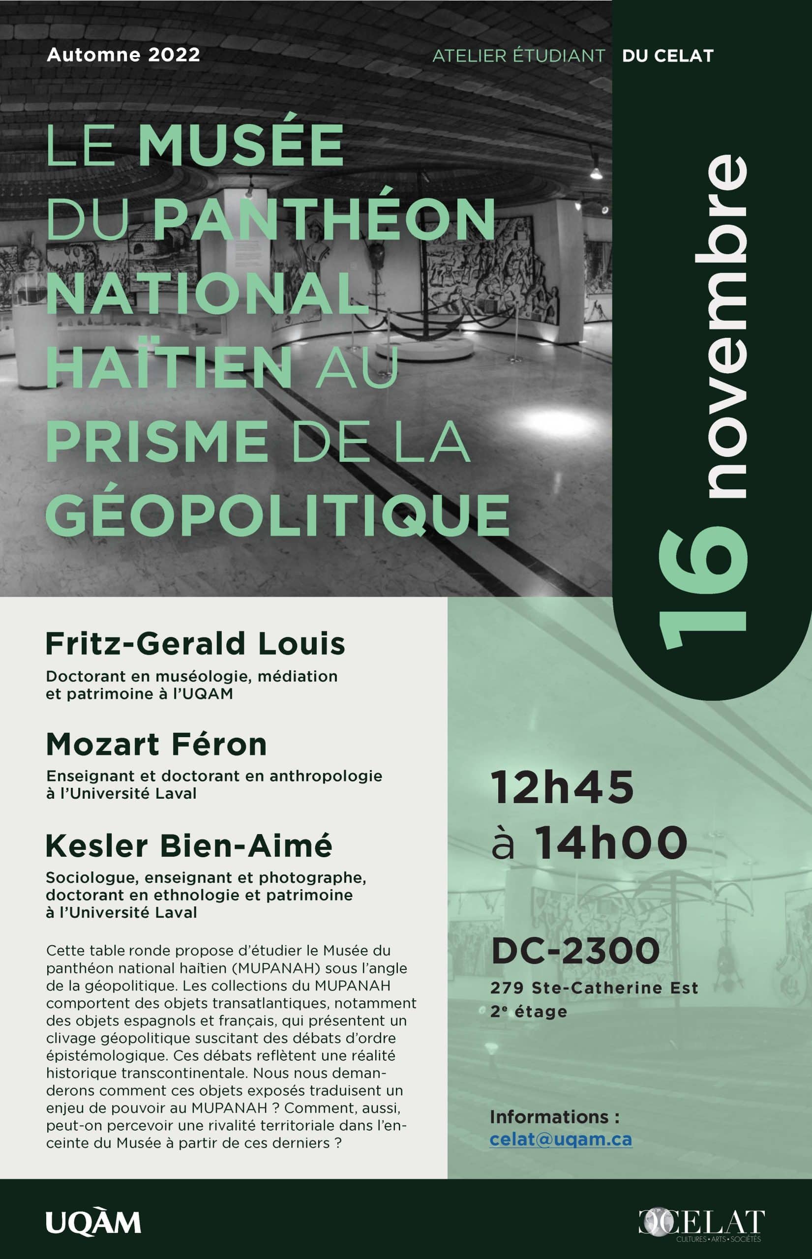 Le CELAT vous convie à la table ronde « Le Musée du panthéon national haïtien au prisme de la géopolitique », qui rassemblera Kesler Bien-Aimé (CELAT), Mozart Féron et Fritz-Gerald Louis (CELAT) le mercredi 16 novembre à 12 h 45 dans les locaux du CELAT-UQAM (DC-2300). L’activité est organisée par Fritz-Gerald Louis, dans le cadre de sa bourse de mi-parcours 3e cycle du CELAT.