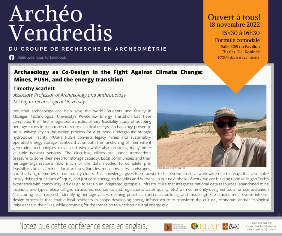 Timothy Scarlett (Michigan Technological University) fera une presentation comodale en anglais intitulée « Archaeology as Co-Design in the Fight Against Climate Change: Mines, PUSH, and the Energy Transition » ce vendredi 18 novembre à 15 h 30 au local 2159 du pavillon Charles-De Koninck. Le lien Zoom de la réunion sera partagé sur la page Facebook du Groupe de recherche en archéométrie le jour de l’événement. Bienvenue à tous-tes!