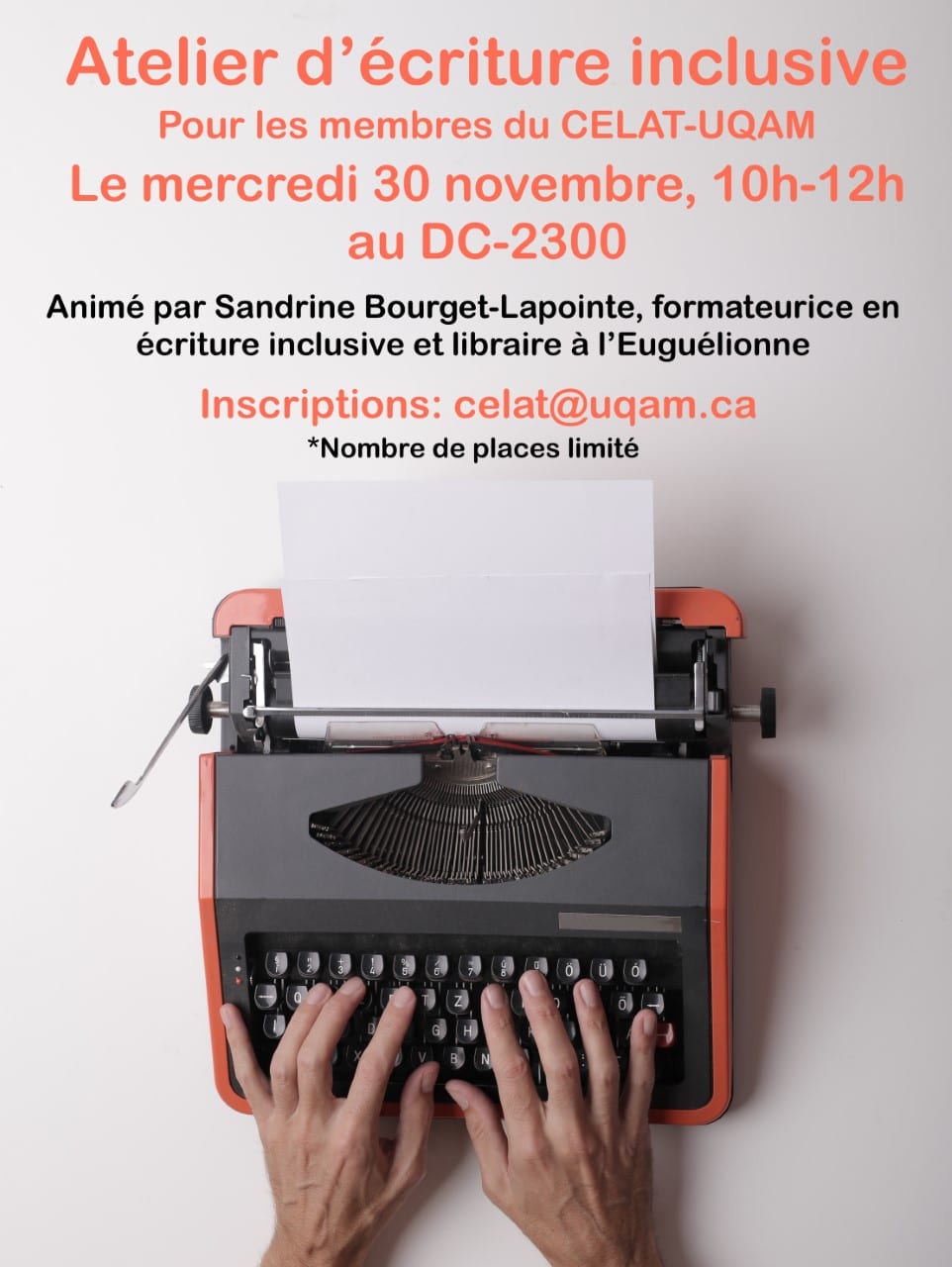 Un atelier portant sur l’écriture inclusive, animé par Sandrine Bourget-Lapointe, formateurice, conseiller-ère en écriture inclusive et libraire à l’Euguélionne, se tiendra le mercredi 30 novembre 2022, de 10 h à 12 h, au CELAT-UQAM (pavillon du Faubourg, salle DC-2300). L’activité est ouverte à tous-tes les membres (étudiant-es, postdoctorant-es, associé-es et enseignant-es) du CELAT-UQAM. Places limitées. Inscription requise : celat@uqam.ca.