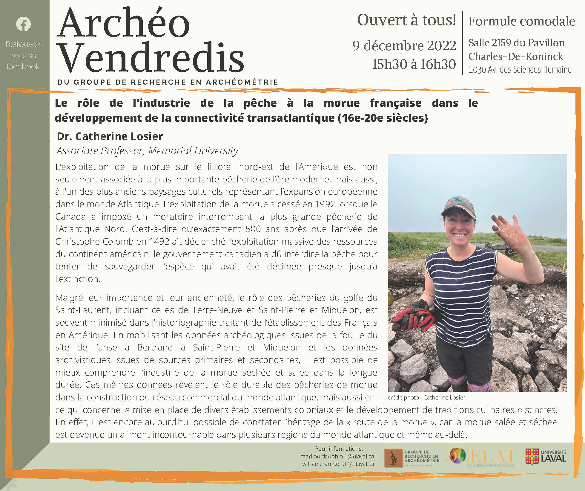 À l’occasion du dernier Archéo-vendredi du trimestre, Catherine Losier (Memorial University) présentera la conférence comodale « Le rôle de l’industrie de la pêche à la morue française dans le développement de la connectivité transatlantique (16e-20e siècles) » ce vendredi 9 décembre à 15 h 30 à l’Université Laval (pavillon Charles-De Koninck, salle 2159) et sur Zoom.