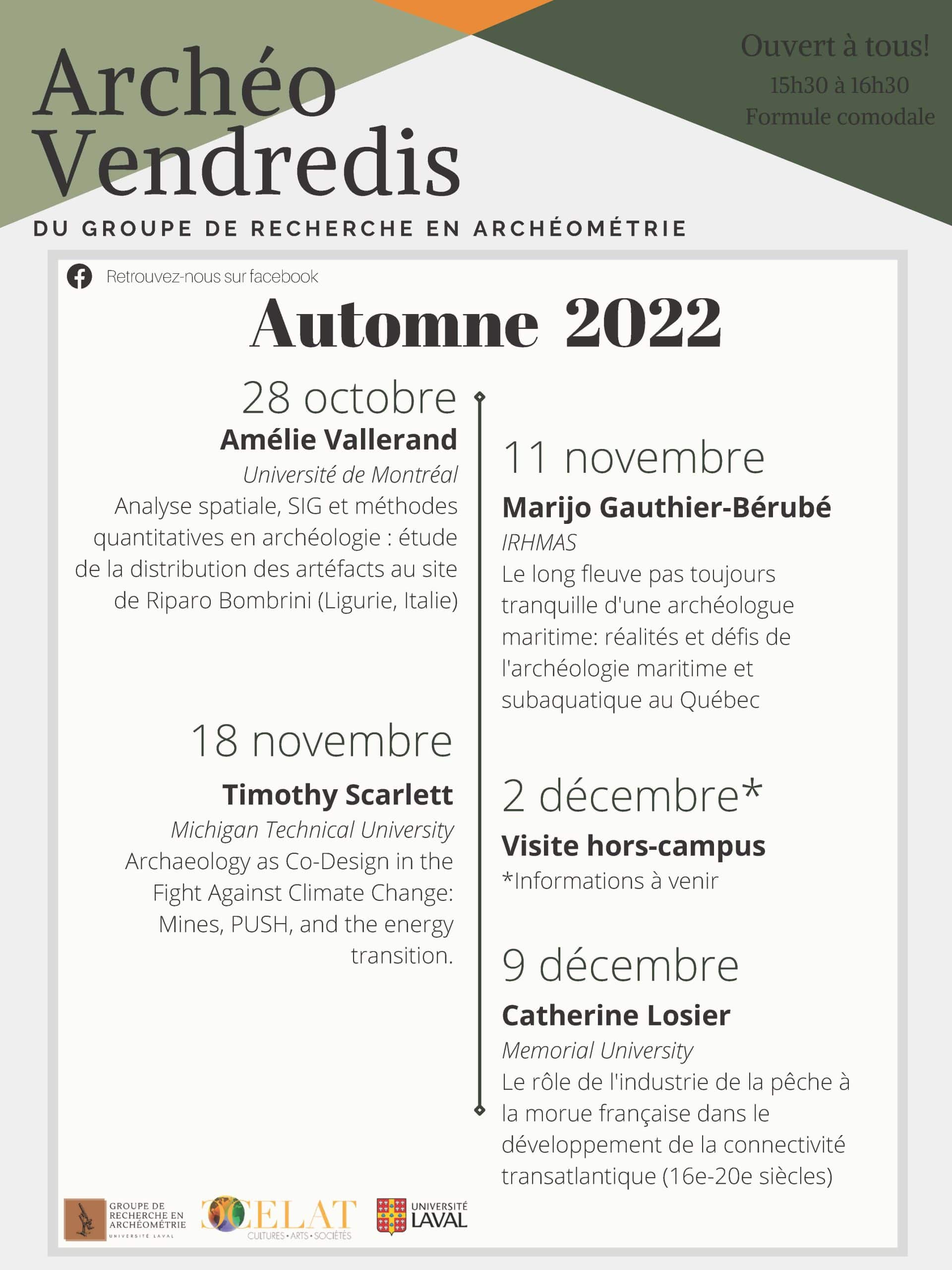 Le 28 octobre, Amélie Vallerand (Université de Montréal) présentera la conférence « Analyse spatiale, SIG et méthodes quantitatives en archéologie : étude de la distribution des artéfacts au site de Riparo Bombrini (Ligurie, Italie) ». La conférence « Le long fleuve pas toujours tranquille d’une archéologue maritime : réalités et défis de l’archéologie maritime et subaquatique au Québec » de Marijo Gauthier-Bérubé (IRHMAS) se tiendra le 11 novembre. Timothy Scarlett (Michigan Technical University) fera une présentation intitulée « Archaeology as Co-Design in the Fight Against Climate Change: Mines, PUSH, and the Energy Transition » le 18 novembre. Catherine Losier (Memorial University) présentera enfin la conférence « Le rôle de l’industrie de la pêche à la morue française dans le développement de la connectivité transatlantique (16e-20e siècles) » le 9 décembre.