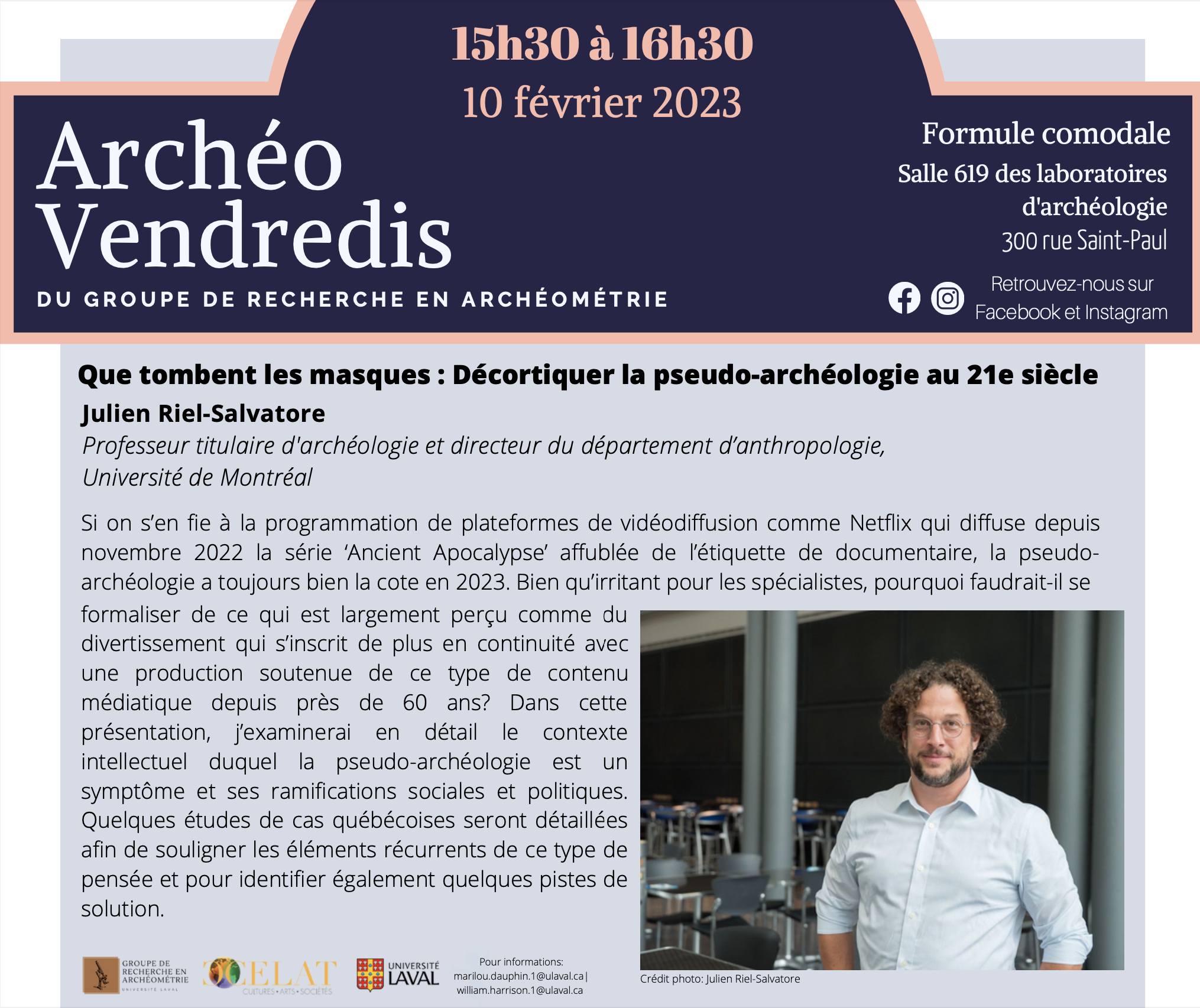 Julien Riel-Salvatore (Université de Montréal) présentera la conférence comodale « Que tombent les masques : décortiquer la pseudo-archéologie au 21e siècle » ce vendredi 10 février, de 15 h 30 à 16 h 30, dans la salle 619 des Laboratoires d’archéologie (300, rue Saint-Paul). Le lien Zoom pour assister à l’activité sera publié prochainement sur la page Facebook du Groupe de recherche en archéométrie. Bienvenue à tous-tes!