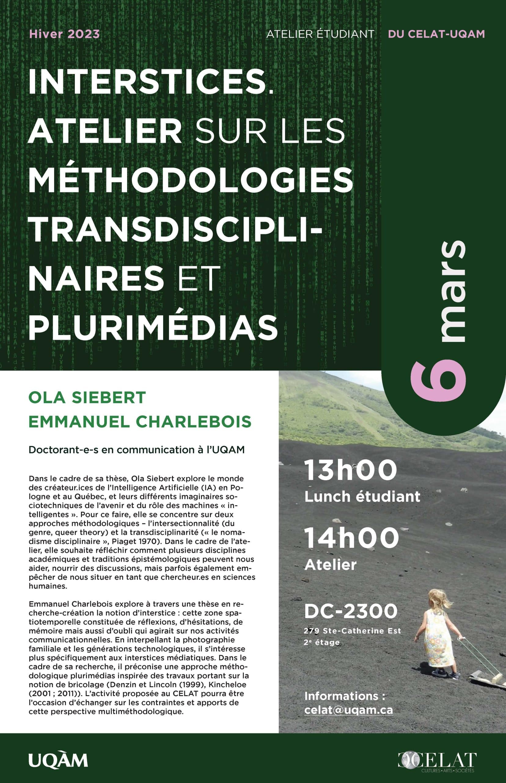 Les membres étudiant-es du CELAT-UQAM sont convié-es à un atelier sur les méthodologies transdisciplinaires et plurimédias avec Ola Siebert (CELAT) et Emmanuel Charlebois (CELAT), doctorant-es en communication à l’UQAM. L’activité, qui se tiendra le lundi 6 mars à 14 h au CELAT-UQAM (DC-2300), sera précédée d’un lunch étudiant dès 13 h. Les personnes intéressées sont invitées à confirmer leur présence par courriel à Estelle Grandbois-Bernard (celat@uqam.ca). Au plaisir de vous y voir!