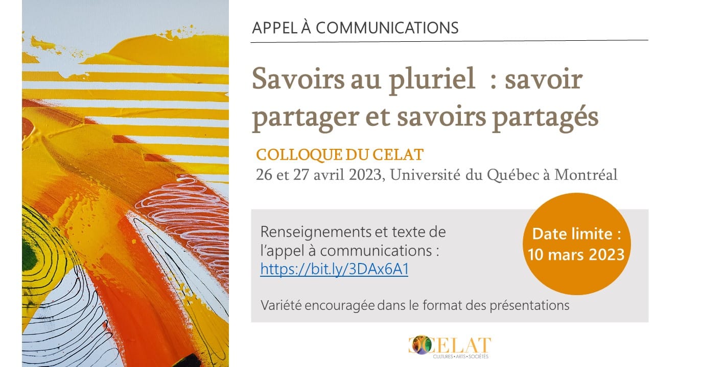 Dans la continuité des travaux portant sur les processus de pluralisation développés au sein du Centre de recherche Cultures – Arts – Sociétés (CELAT), le colloque Savoirs au pluriel : savoir partager et savoirs partagés, organisé par ce même centre, mettra l’accent sur de nouvelles pistes de réflexion, postures épistémologiques et avenues innovantes dans les manières de penser et de faire la recherche et la recherche-création, pistes qui permettront une transition vers la conception de la programmation scientifique du centre pour 2024-2030. Les méthodologies de recherche et de recherche-création seront sources d’inspiration, puisque les travaux théoriques et empiriques menés ces dernières années au centre révèlent une diversité méthodologique surprenante. Celle-ci ouvre des terrains peu connus, tout en faisant place à une analyse autoréflexive vis-à-vis de nos modes de production et de partage des savoirs, dans un monde qui se caractérise de plus en plus par des crises et des injustices sociales et culturelles – récemment accentuées par la pandémie de COVID-19 et exprimées par des voix qui se polarisent ou s’(in)visibilisent. La communauté des chercheuses et chercheurs ne reste pas insensible à ces ruptures et transformations, qui apportent des questionnements d’ordres éthique, épistémologique et méthodologique. Comment penser les mondes qui nous habitent et que nous habitons, en tant que chercheuses, chercheurs, mais aussi en tant qu’individus? Quelle place donner aux affects et à leurs diverses cristallisations : vulnérabilités, subjectivités, ressentis individuels et collectifs ou empathie? Quelles postures peut-on envisager et développer à leur égard? Le numérique et l’avènement de l’IA exacerbent déjà les injustices sociales et culturelles, mais dans quelles perspectives peuvent-ils également offrir des outils puissants d’analyse, de création et de résolution de problème?