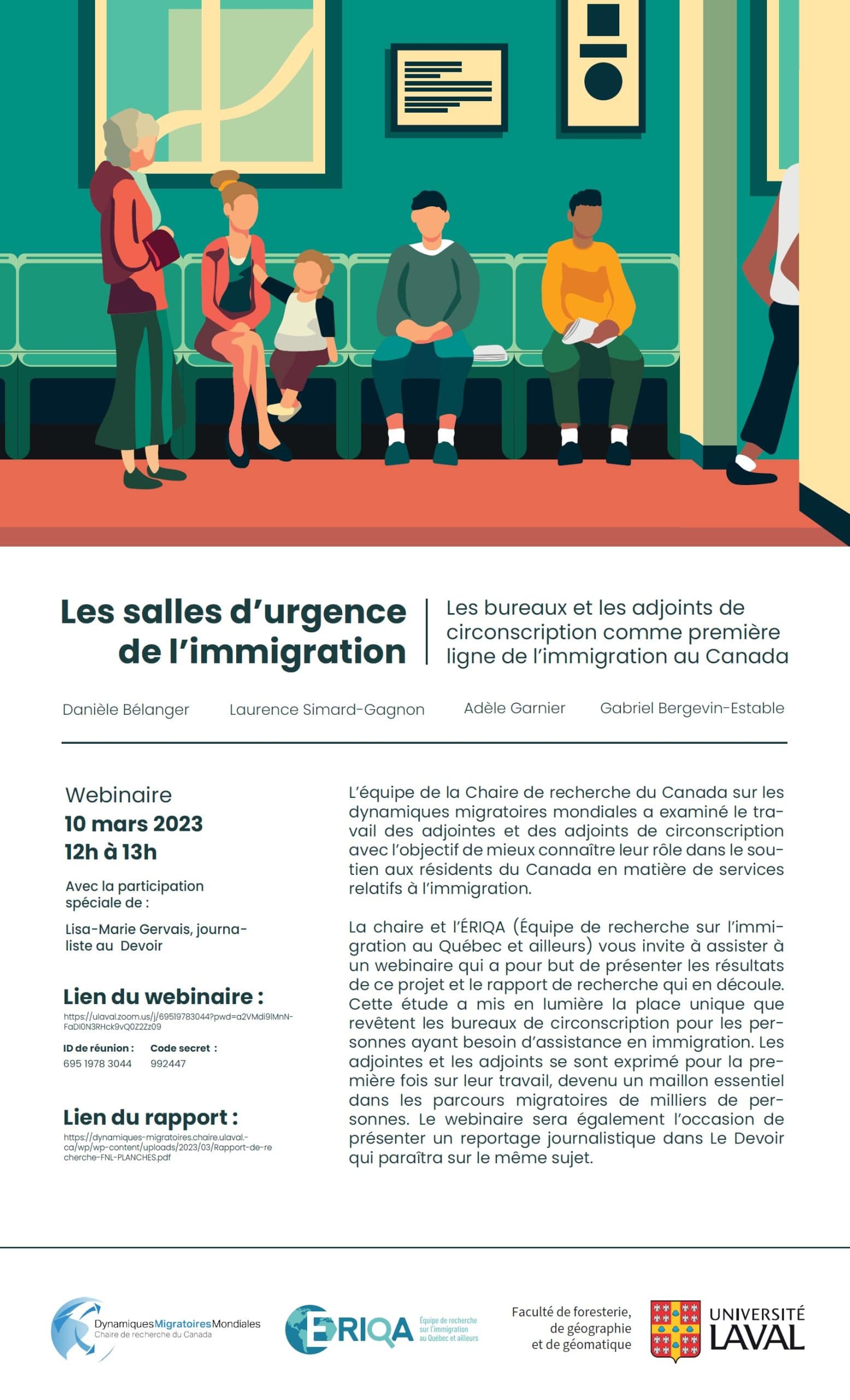 L’équipe de la Chaire de recherche du Canada sur les dynamiques migratoires mondiales a examiné le travail des adjoint-es de circonscription dans l’objectif de mieux connaître leur rôle dans le soutien aux résident-es du Canada en matière de services relatifs à l’immigration. La Chaire et l’ÉRIQA (Équipe de recherche sur l’immigration au Québec et ailleurs) vous invitent à assister, ce vendredi 10 mars 2023, de 12 h à 13 h, à un webinaire qui vise à présenter les résultats de ce projet et le rapport de recherche qui en découle. Cette étude a mis en lumière la place unique que revêtent les bureaux de circonscription pour les personnes ayant besoin d’assistance en immigration. Les adjoint-es se sont exprimé-es pour la première fois sur leur travail, devenu un maillon essentiel dans les parcours migratoires de milliers de personnes. Le webinaire sera également l’occasion de présenter un reportage journalistique qui paraîtra sur le même sujet dans le journal Le Devoir. L’équipe recevra à ce titre la journaliste Lisa-Marie Gervais.